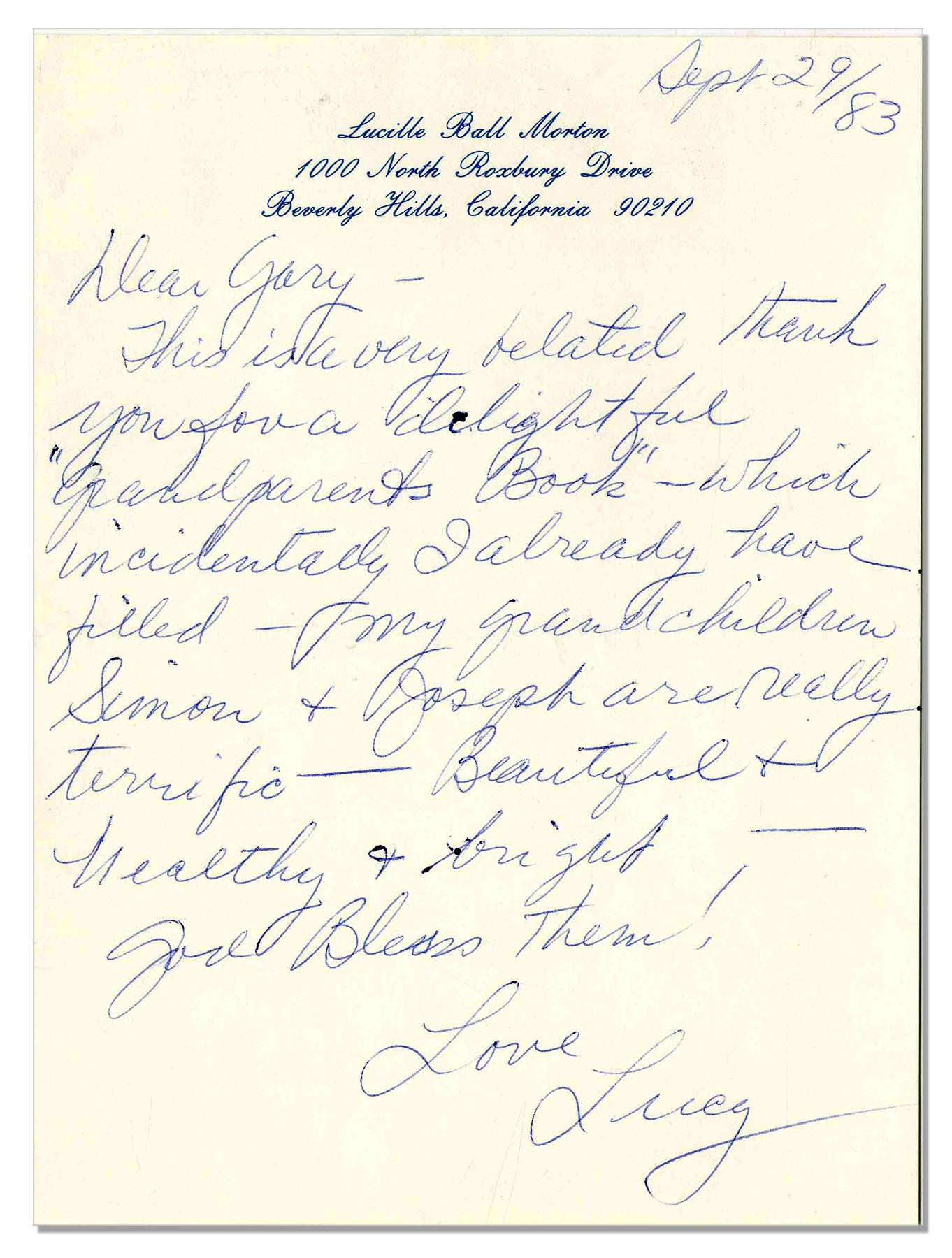 Lucille Ball autograph letter signed on ''Lucille Ball Morton / 1000 North Roxbury Drive / Beverly Hills, California 90210'' stationery, dated 29 September 1983. Letter, written in blue ink, thanks a Gary Erickson for a book titled ''Grandparents Book'' and reads in part: ''…which incidentally I already have filled -- my grandchildren Simon & Joseph are really terrific…'' Signed boldly ''Love / Lucy''. Letter, measuring 5.75'' x 7.75'' has minor ink blots on a few letters, though not affecting signature. Includes original envelope. Near fine.