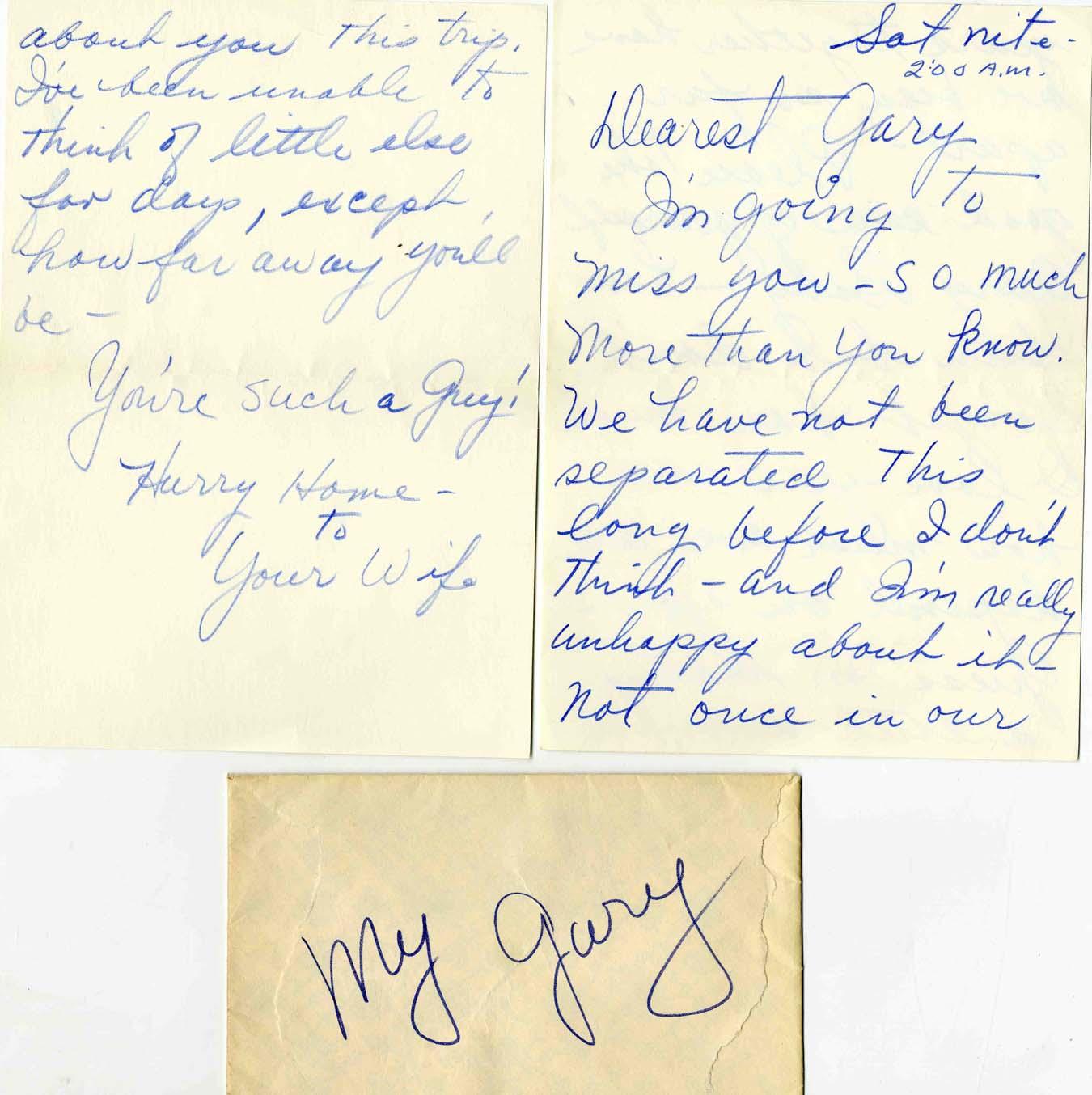 Lucille Ball handwritten letter, unsigned, to her husband Gary Morton. In part, ''Sat nite - 2:00 a.m. Dearest Gary, I'm going to miss you - so much more than you know. We have not been separated this long before I don't think - and I'm really unhappy about it…Guess I'm really a little worried about you this trip. I've been unable to think of little else for days, except how far away you'll be…Hurry Home to Your Wife.'' 3pp. on two 5.5'' x 8'' sheets. Very good condition. With original envelope addressed ''My Gary'' which is torn on sides.