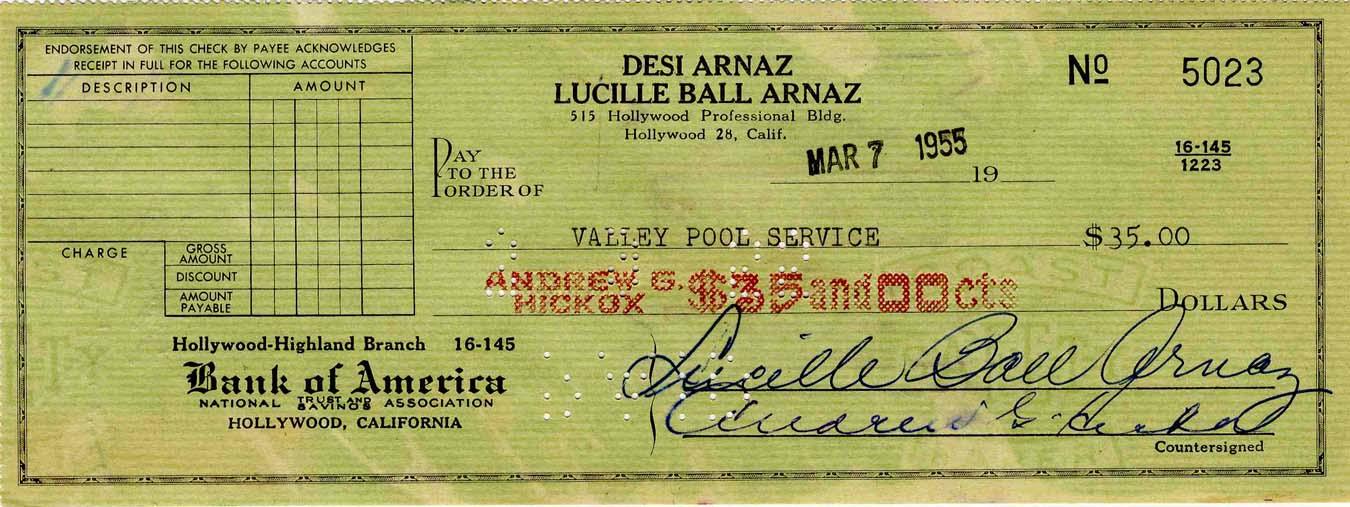 Check signed by beloved comedienne Lucille Ball. Dated 7 March 1955, check in the amount of $35.00 is written to Valley Pool Service and signed in full, ''Lucille Ball Arnaz'' in blue ink. Written upon her and husband Desi Arnaz's bank account in Hollywood. Countersigned by another individual whose first name is Andrew. 8.25'' x 3'' check in very good condition with one fold and some light discoloration around edges.