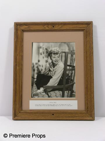 Lucille Ball wood framed movie photo of her sitting in a chair and brief description of her career at the bottom. (approx. 16 1/2" x 13 1/2")