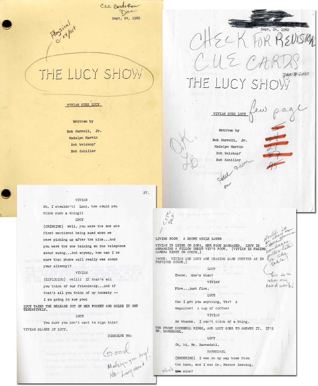 Lucille Ball initialed ''Lucy'' script from with many notes in her own hand. Episode entitled, “Vivian Sues Lucy,” dated 24 September 1962. Initialed, “O.K. LB,” in pencil. Excerpts from Ball's script notations read: “I would say Lucy is looking…very reluctant but Mr. B. just can't wait…” & “Would it be okay to have some bandages…etc…this is to show my hard work!” & “I think it would be turn tables if I went down.” Script runs 50pp. and measures 8.5'' x 10.5''. Bottom half of last page torn off; not affecting any text. Very good.