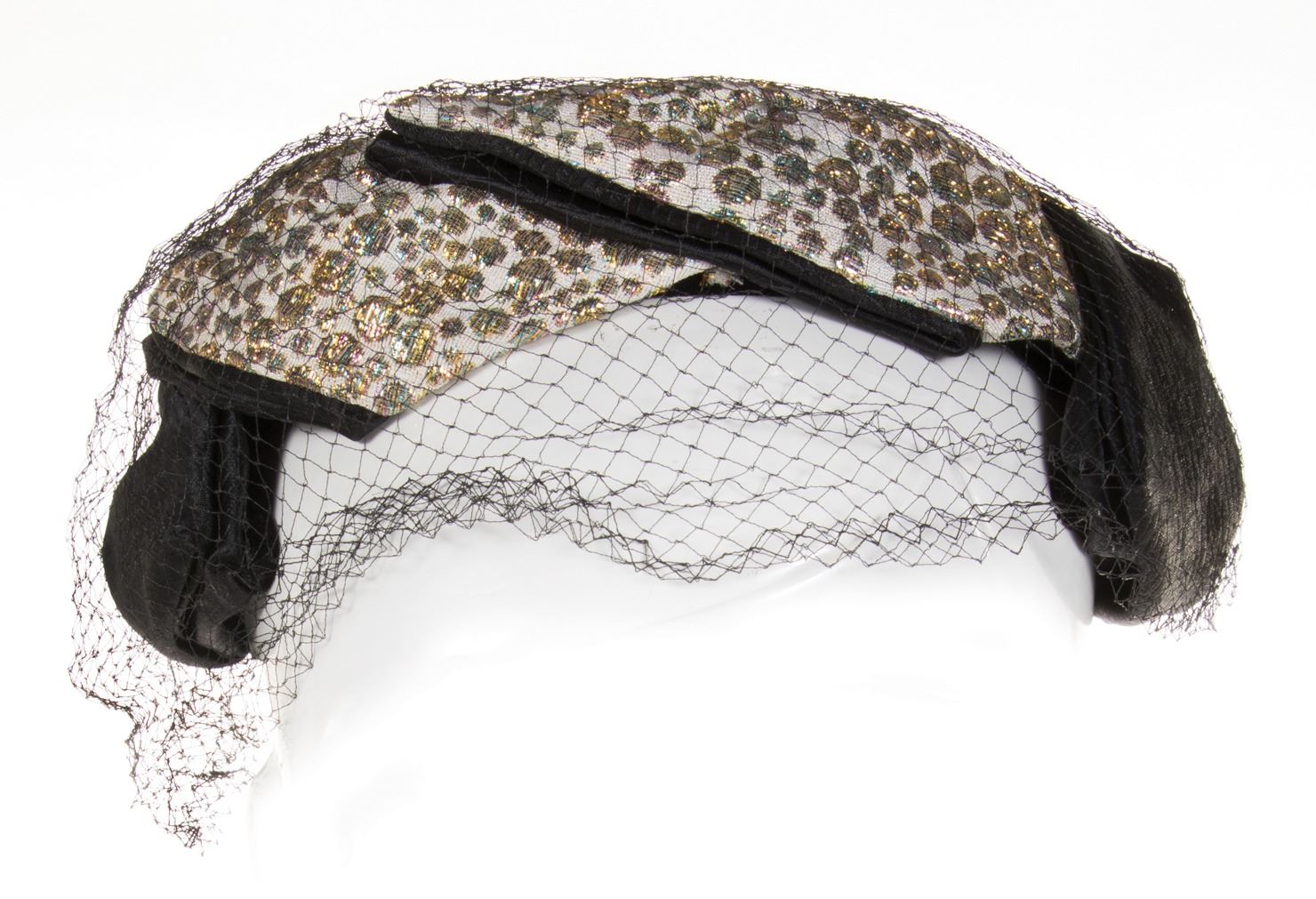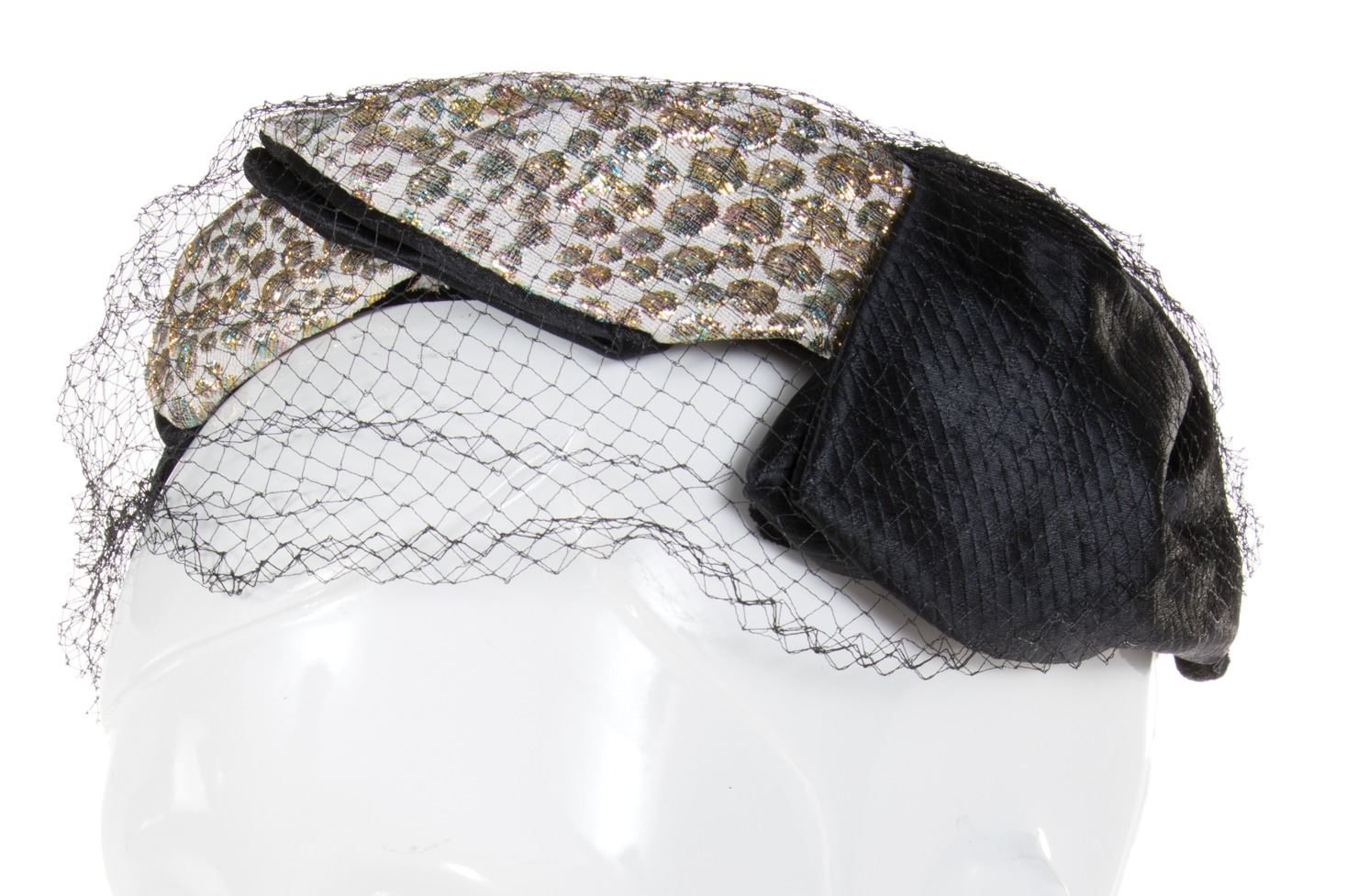 2. Lucille Ball "Lucy" fascinator from I Love Lucy. (Desilu, 1951-1957) Vintage original couture hat of textured black satin and ivory silk ribbon with gold bullion thread embroidered embellishment. Constructed on a wire mesh enforced internal hatband, with velvet stays for pinning to hair. Finished with a short black mesh veil. Worn by Lucille Ball in the classic comedy series. Originally purchased at the 1967 Desilu studio auction. Exhibiting minor age and wear. In vintage very fine condition. $800 - $1,200
