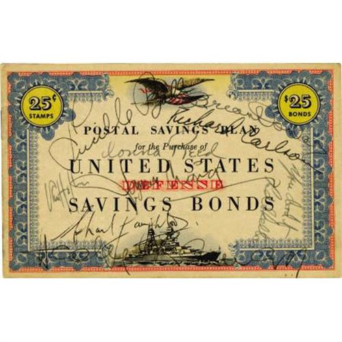 <B>Lucille Ball, Van Heflin, and Others Signed Defense Stamp Album.</B></I> A 25-cent Defense Stamp album issued during World War II, signed on the front cover by Lucille Ball, Van Heflin, Donna Reed, Richard Carlson, Red Skelton, and others in black ink. In Very Fine condition with mild wear and toning, primarily to the back cover. <I>From the collection of John Strangi.</B></I> <I>Accompanied by LOA from PSA/DNA.</B></I><BR><BR><b>Shipping:</b> Flat Material, Small (<a target="_blank" href="http://www.heritageauctions.com/common/shipping.php">view shipping information</a>)