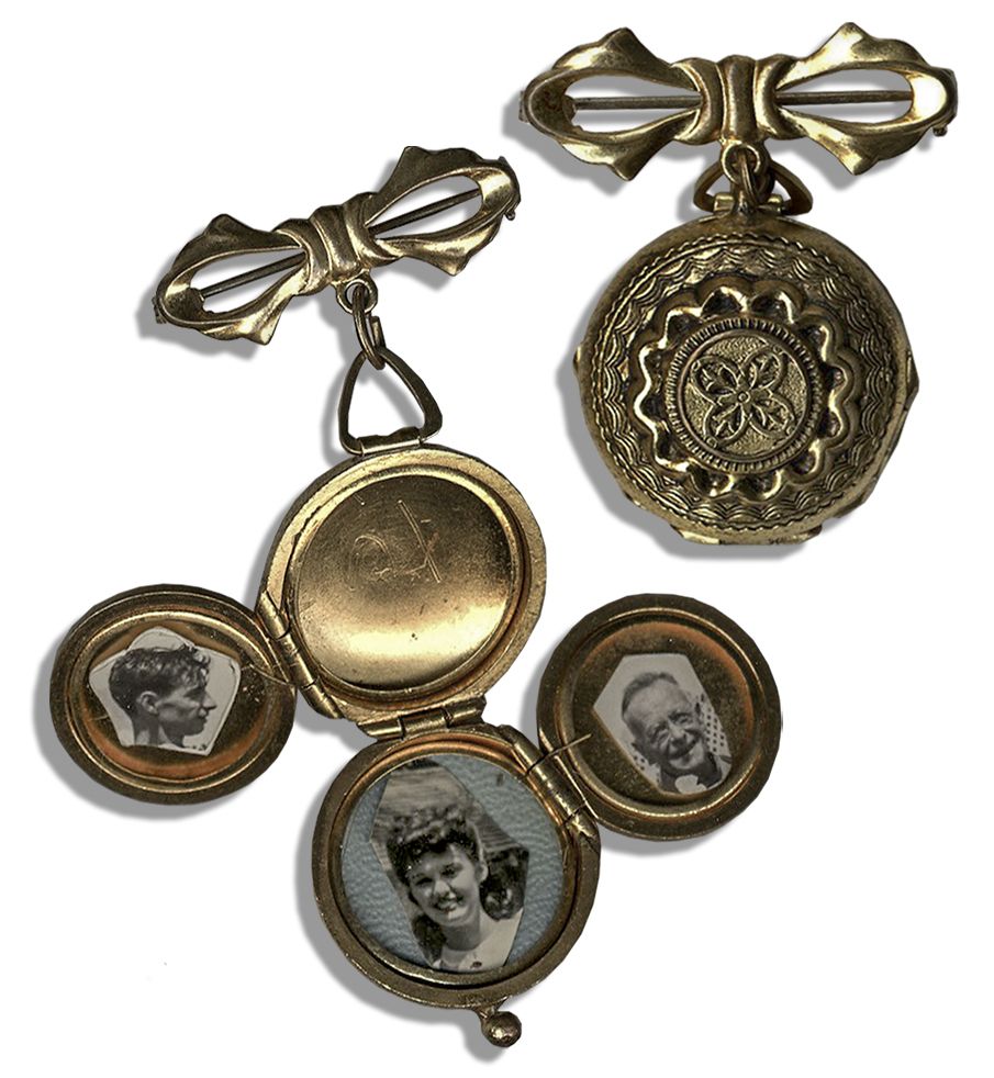 Lucille Ball personally owned locket containing photos of her family members. Vintage 1940's gold-tone locket dangles from a bow-shaped brooch pin. Round locket pops open with a total of four round photo frames on hinges, three of which are filled with tiny clipped photos of Lucy's family members. Photos are of Lucy's brother, Fred Ball, her cousin Cleo Mandicos Smith and her maternal grandfather Fred Charles Hunt. Costume jewelry is made of metal with a wavy concentric pattern on verso that appears to a limited extent on the front, surrounding a raised design. At center on the front is a quatrefoil with slightly elongated segments that each feature a tiny form resembling a very plain fleur-de-lis in the center. Locket measures 1.5'' x 1.75''. A highly personal piece in near fine condition. With a COA from Lucie Arnaz and an additional signed card from Arnaz identifying Lucy's relatives in the locket.