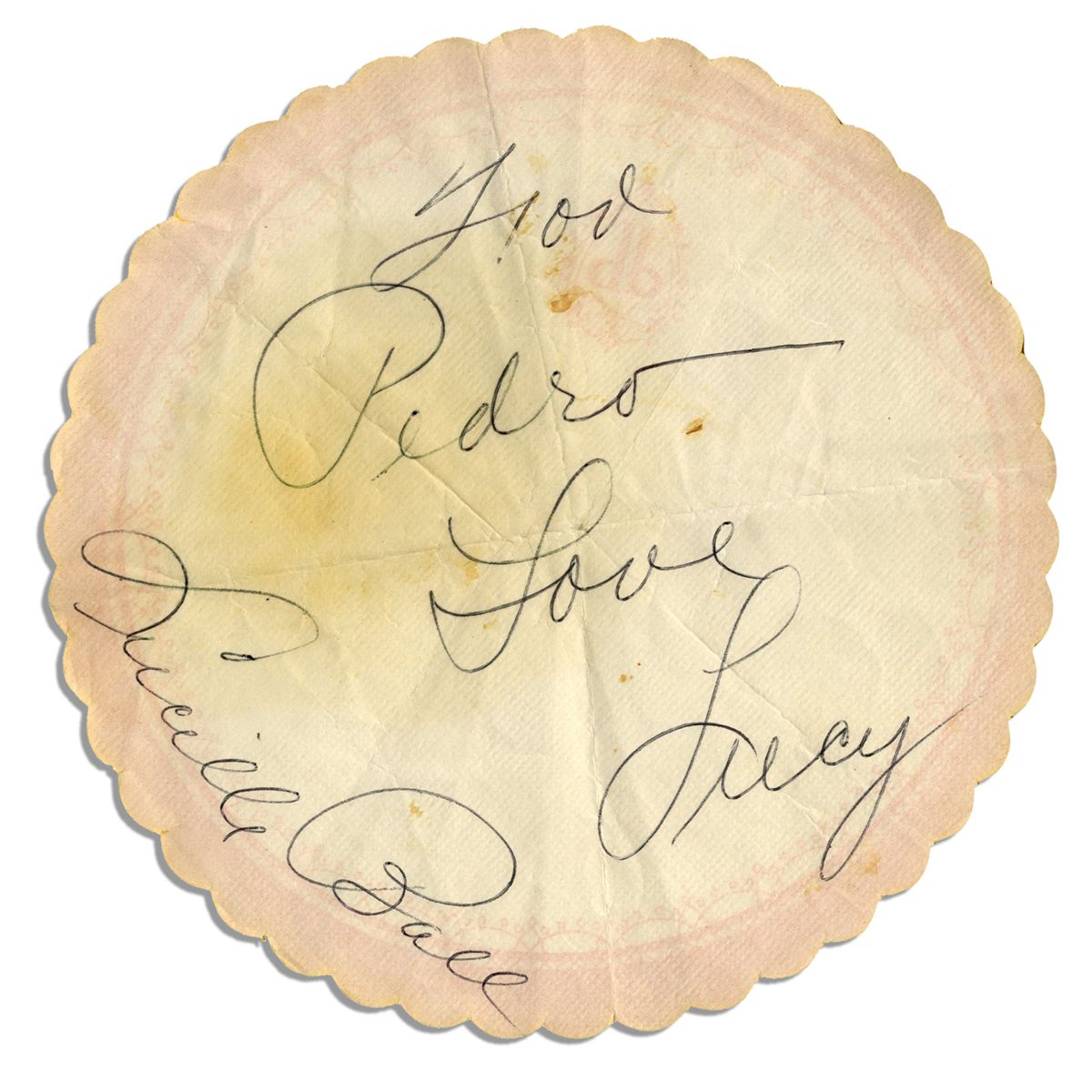 Lucille Ball signature on verso of a paper coaster. Signed and inscribed, ''For Pedro Love Lucy / Lucille Ball'' in black ink. Coaster measures 6'' in diameter with toning throughout, else very good.