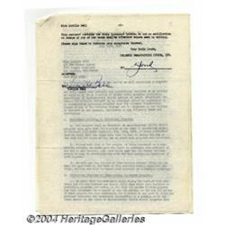 <B>Lucille Ball Signed Radio Contract.</B></I> This seven-page contract, signed July 12, 1948 between Lucille Ball and CBS, secures the actress's services to perform on the weekly radio series "My Favorite Husband". Ball has signed on page seven. This radio hit ran from 1948-1951, starring the actress and Richard Denning as Liz and George Cooper. The show was the immediate precursor to TV's "I Love Lucy", thus this document represents a poignantly pivotal time in the Queen of Comedy's career. It is a well-known fact that for most of her life, Ball refused to sign her full name and only signed "Love Lucy." Here is a chance to own a gorgeous, full, vintage signature of one of the world's most beloved stars. <I>Accompanied by COA from PSA/DNA. </B></I> <BR><BR><B>Important notice:</B> Heritage usually auctions material at the rate of 200-250 lots per hour. On some occasions eBay Live bid software or the Internet may not be able to keep up with the pace of the auction. We recommend placing a realistic absentee bid now as insurance to avoid disappointment. Occasionally the auctioneer may eliminate or reject an eBay Live bid, and the auctioneer may also reopen a lot after the close of the eBay live bidding (usually because we missed an audience bid), and may reject your bid even if it shows you as the winning bidder. By bidding via eBay Live, you agree that Heritage may award the lot to another bidder at its sole discretion under the circumstances described above or any other reasonable circumstances. Since eBay bids are not shown to us until we open the lot on the floor, we treat those bids just like floor bids. In most cases the floor responds before the eBay bid is presented to us, due to Internet lag time, so for consistency we have made it a policy that floor bids are always considered first over tie eBay live bids. Also please note that all Heritage lots purchased through eBay Live carry a 24.5% Buyer's Premium. Please make sure you read the Terms and Conditions before you bid.