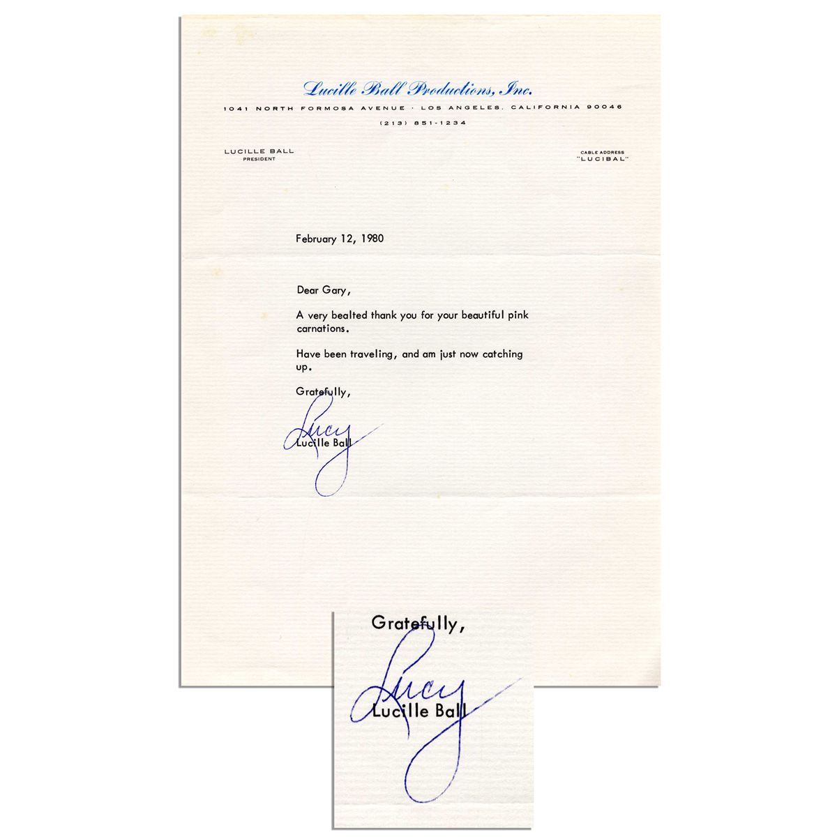Lucille Ball typed letter signed ''Lucy'' in blue ink. Written on Lucille Ball Productions, Inc. stationery where Lucy served as President. Dated 12 February 1980, letter reads in full ''Dear Gary, A very bealted [sic] thank you for your beautiful pink carnations. Have been traveling, and am just now catching up. Gratefully, [signed] Lucy''. 7.25'' x 10'' letter is near fine.