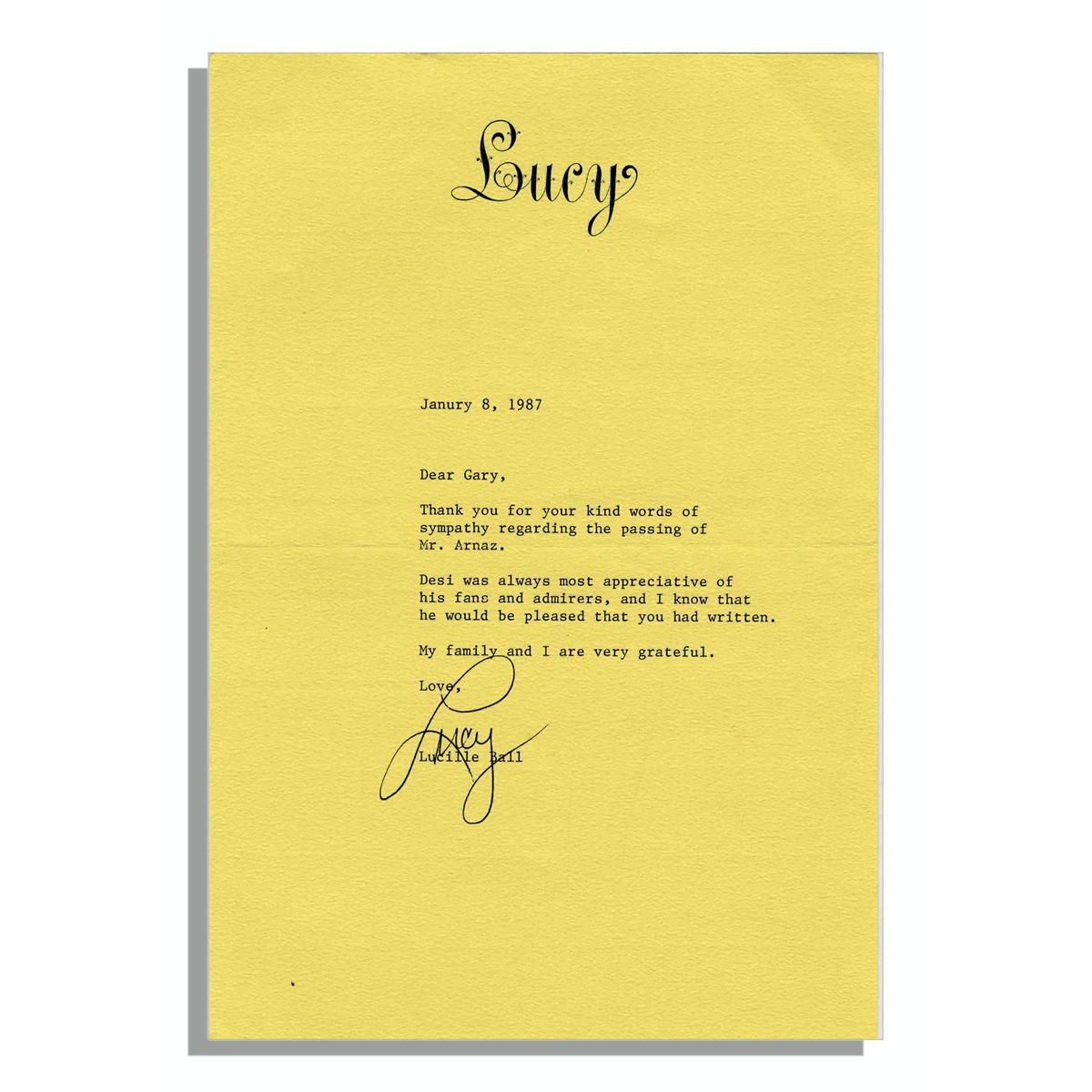 Lucille Ball typed letter signed regarding the death of Desi Arnaz. Letter dated 8 January 1987 reads in part ''...Thank you for your kind words regarding the passing of Mr. Arnaz. Desi was always most appreciative of his fans...and I know he would be pleased that you had written...'' Letter signed ''Lucy'' in ink measures 6.25'' x 9.25''. Accompanied by envelope addressed to Gary Erickson. Near fine condition.