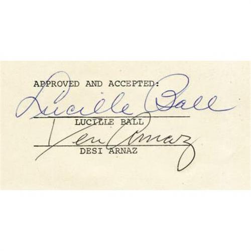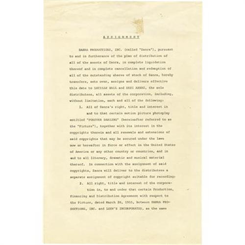 <B>Lucille Ball and Desi Arnaz "Forever Darling" Signed Contract.</B></I> A two-page copyright assignment between Zanra Productions and Lucille Ball and Desi Arnaz, dated August 21, 1968, signed by Ball in blue ink and Arnaz in black on the second page. The movie, made in 1956, had been Desilu's initial attempt at film production, and was the duo's follow-up to their highly successful <I>The Long, Long Trailer.</B></I> It failed at the box office, and most subsequent attempts to bring projects to the big screen were aborted, until the more successful <I>Yours, Mine, and Ours</B></I> (with Ball and Henry Fonda) was released in 1968. (<I>Forever Darling</B></I> was produced at Desilu under the aegis of Zanra Productions -- "Arnaz" spelt backwards.) In Very Fine condition with mild overall toning, staple holes to the upper left corner, and some creasing and a small stain near the top edge of the front page. <I>From the collection of John Strangi.</B></I> <I>Accompanied by LOA from PSA/DNA.</B></I><BR><BR><b>Shipping:</b> Flat Material, Small (<a target="_blank" href="http://www.heritageauctions.com/common/shipping.php">view shipping information</a>)