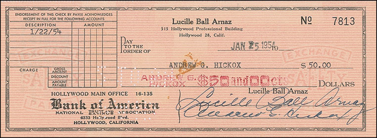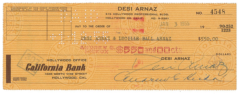 Two personal checks: one 8.5 x 3, filled out in type and signed by Lucille Ball Arnaz, payable to Andrew G. Hickox for $50.00, January 25, 1954; and one 8 x 3, filled out in type and signed by Desi Arnaz, payable to Desi Arnaz & Lucille Ball Arnaz for $550.00, January 3, 1955. In fine condition, with a small stain on the first check, and the expected cancellation stamps and holes, none of which affect the signatures. Accompanied by a color glossy of Ball and Arnaz.