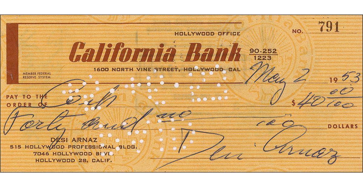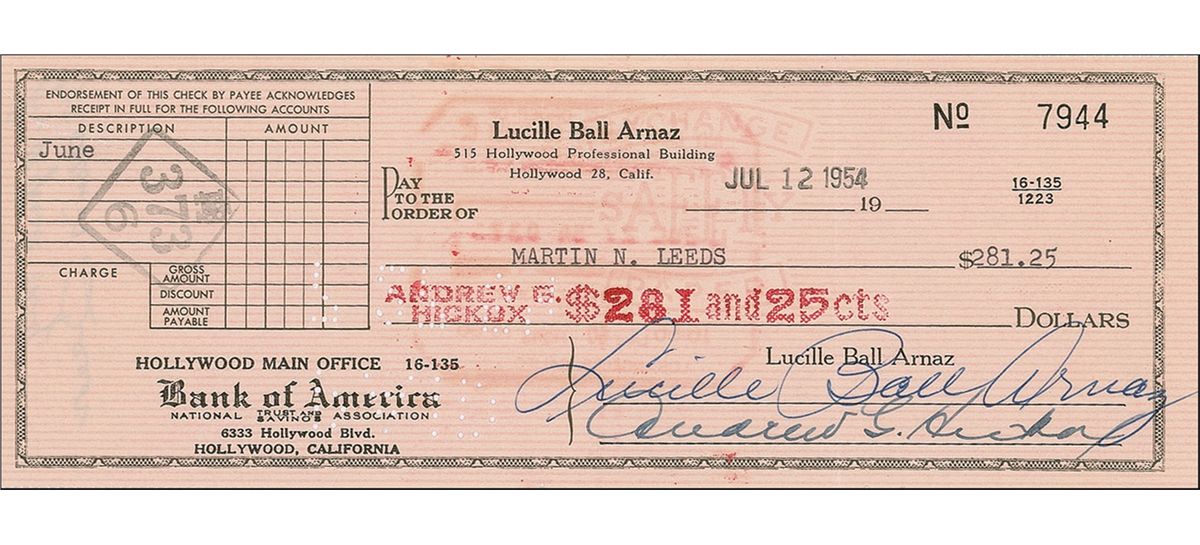 Two checks: personal check, 8.5 x 3, filled out in type and signed “Lucille Ball Arnaz,” payable to Martin N. Leeds for $281.25, stamp-dated July 12, 1954; and a bank check, 6.25 x 2.75, filled out and signed by Desi Arnaz, payable to Cash for $40.00. In very good condition, with vertical folds to both checks, expected stamps and holes, and adhesive remnants to reverse of Desi’s check.