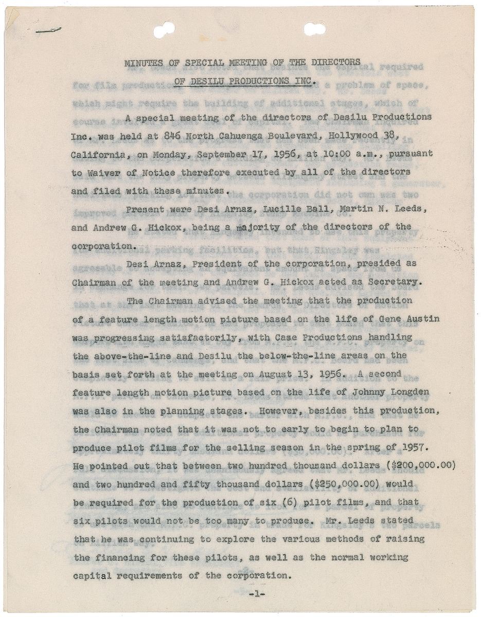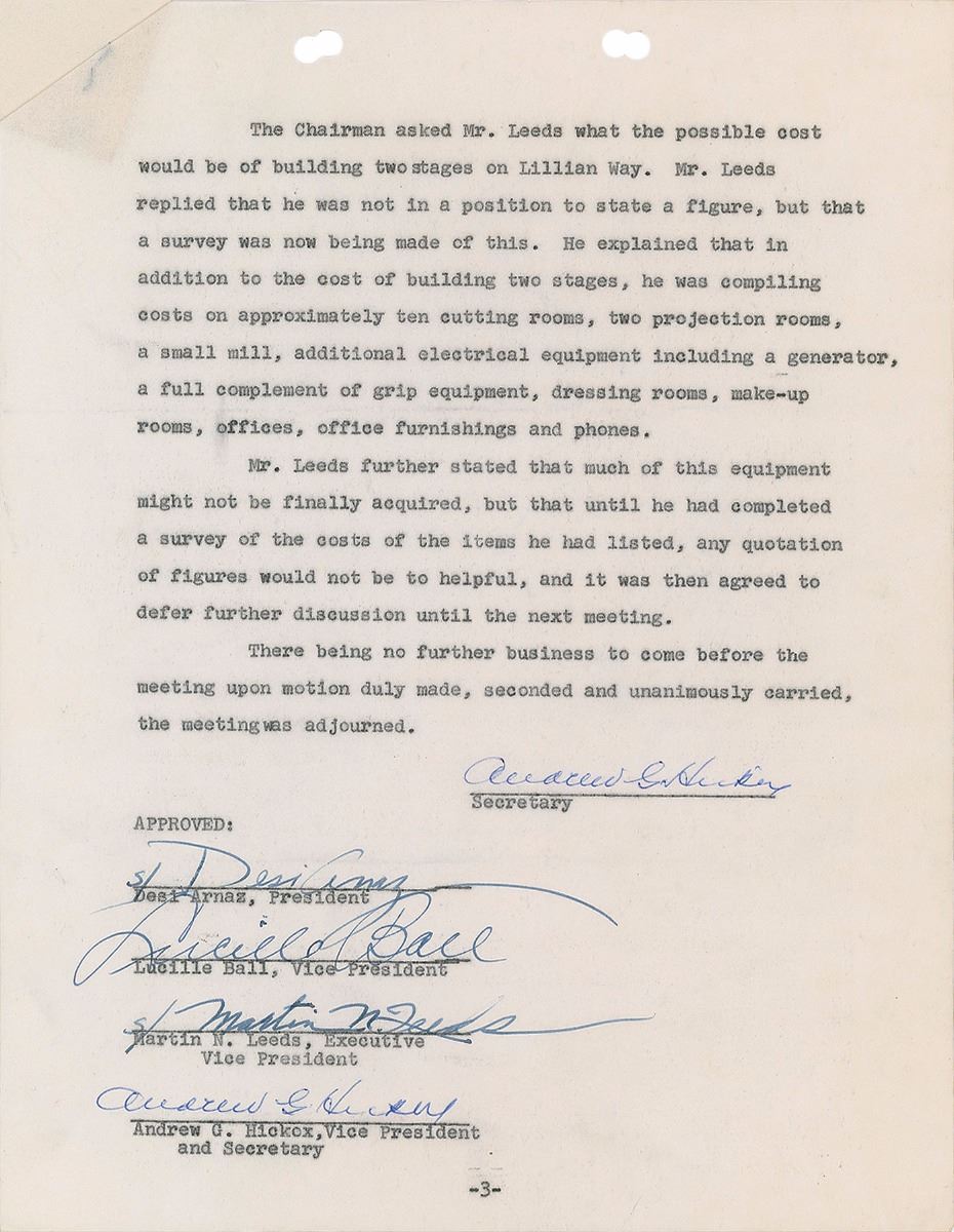 DS, three onionskin pages, 8.5 x 11, September 17, 1956. Minutes of a special meeting of the directors of Desilu Productions, Inc., in which “a feature length motion picture based on the life of Gene Austin was progressing satisfactorily” and that “a second feature length motion picture based on the life of Johnny Longden was also in the planning stages.” Signed at the conclusion in ballpoint and fountain pen by Desi Arnaz, Lucille Ball, Martin Leeds, and Andrew G. Hickox. In fine condition. Accompanied by a full letter of authenticity from PSA/DNA.