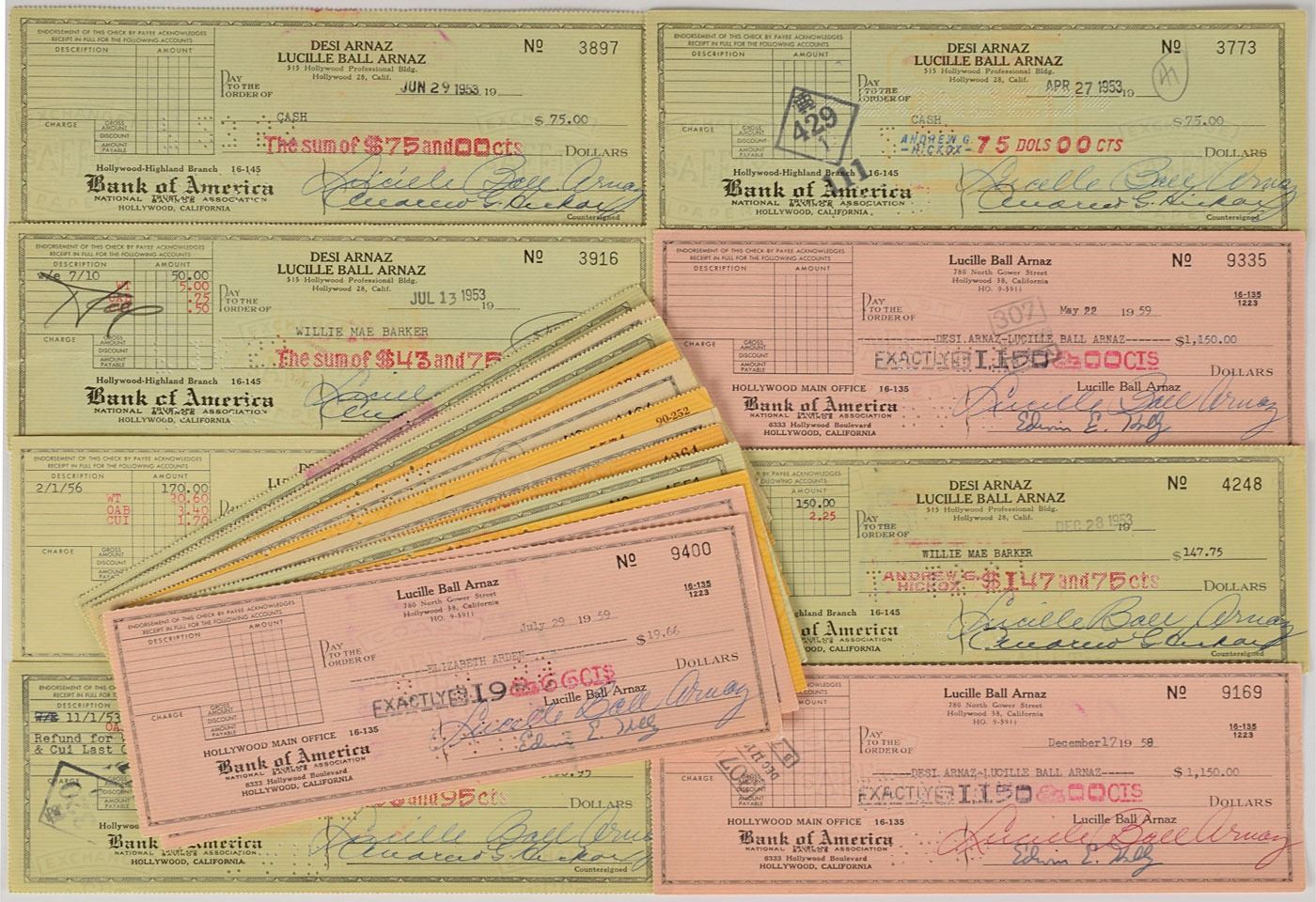 Collection of twenty personal checks, each approximately 8 x 3, dated 1953–1959, all filled out in type and signed by either Ball or Arnaz, including ten signed "Lucille Ball Arnaz," and ten signed "Desi Arnaz." In overall very good to fine condition.