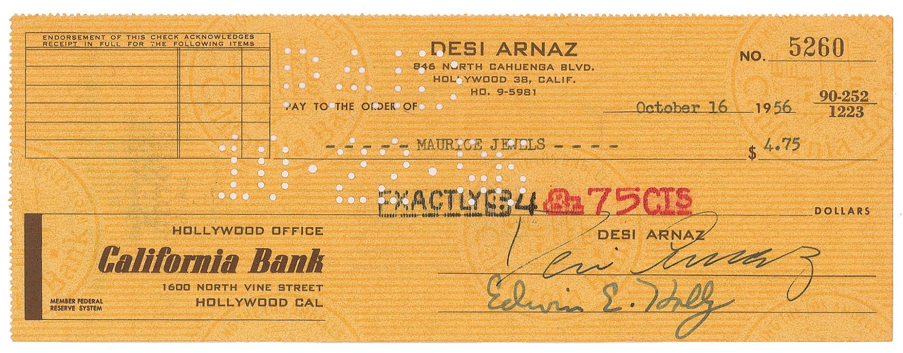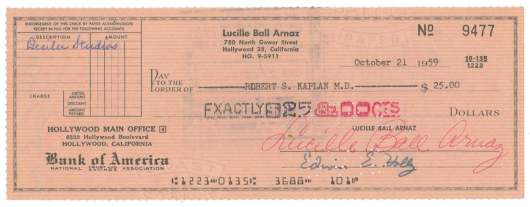 Two personal checks: one filled out in type and signed by Lucy Ball, "Lucille Ball Arnaz," payable to Robert S. Kaplan for $25, October 21, 1959; and one filled out in type and signed by Desi Arnaz, "Desi Arnaz," payable to Maurice Jewels for $4.75, October 16, 1956. In overall fine condition.