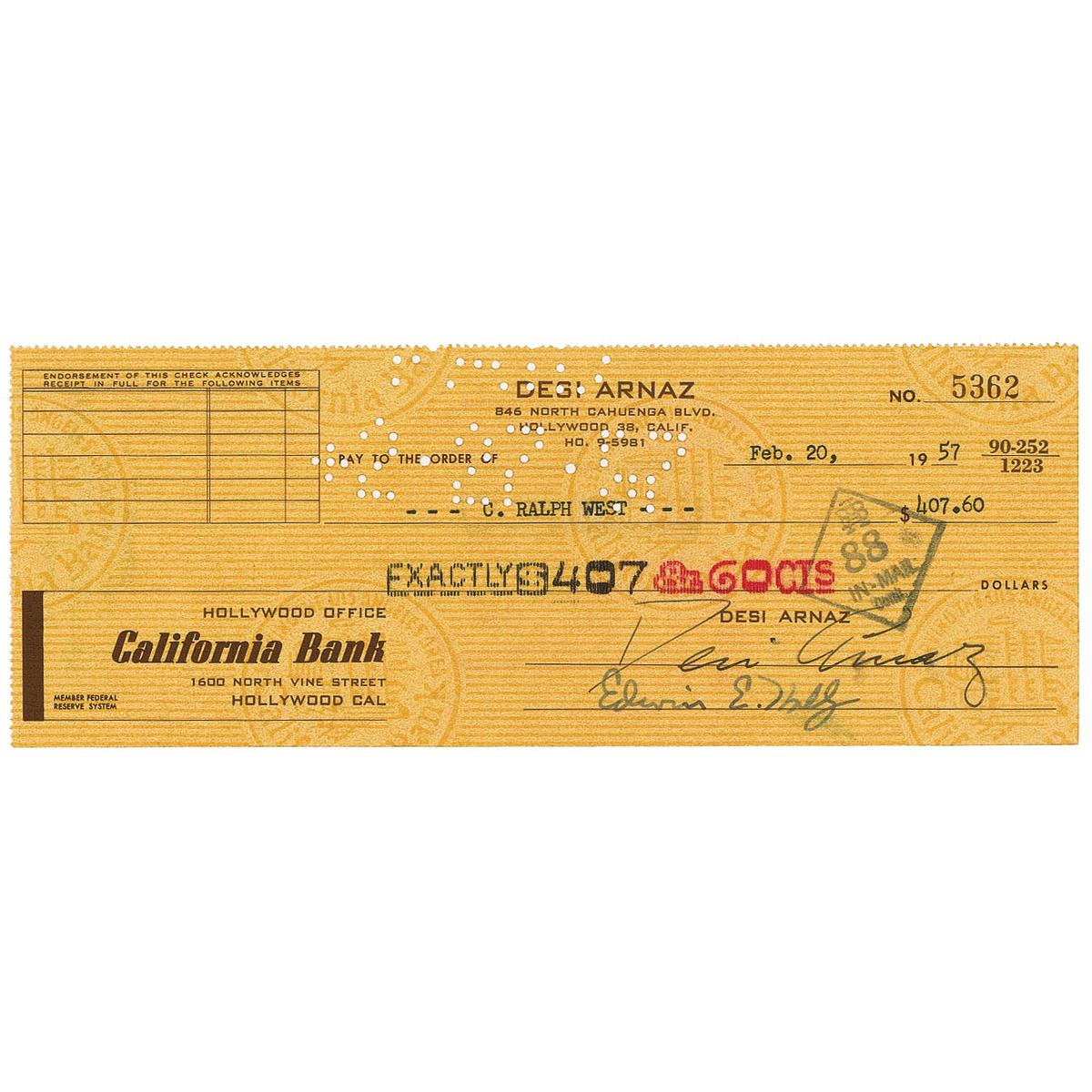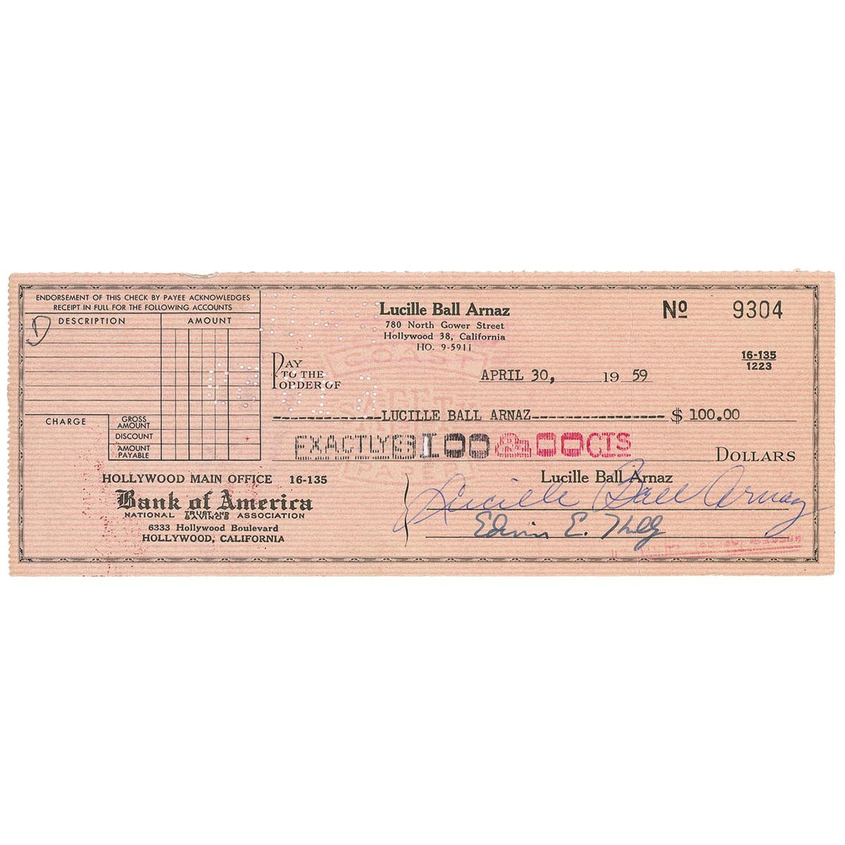 Two items: twice-signed personal check, 8.25 x 3, filled out in type and signed in blue ballpoint “Lucille Ball Arnaz,” payable to herself for $100.00, dated April 30, 1959, and endorsed on the reverse again with her full name; and personal check, 8.25 x 3, filled out in type and signed in black fountain pen “Desi Arnaz,” payable to C. Ralph West. In very good condition, with three vertical folds to Ball’s check touching her name and expected cancellation holes and stamps to both checks (touching signatures).