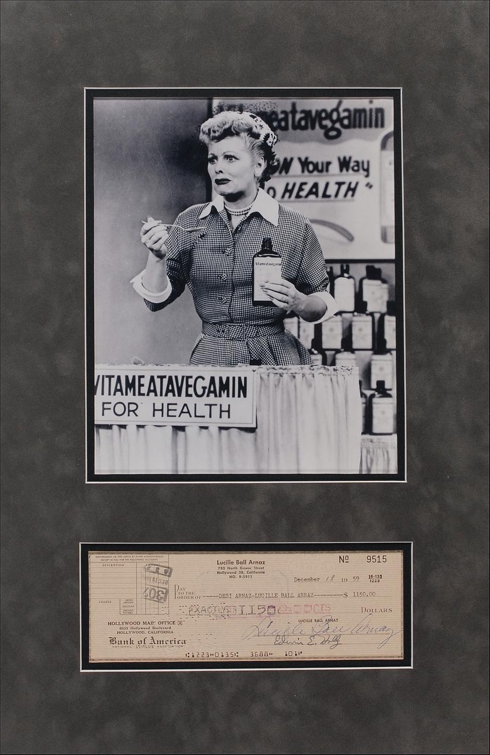 Personal check, 8 x 2.75, filled out in type and signed “Lucille Ball Arnaz,” payable to Desi Arnaz–Lucille Ball Arnaz for $1150.00, December 18, 1959. Double suede matted with a portrait of the famed ‘Vitameatavegamin’ scene. In fine condition, with expected cancellation stamps and holes to checks, with show-through from a stamp on the reverse touching her first name.