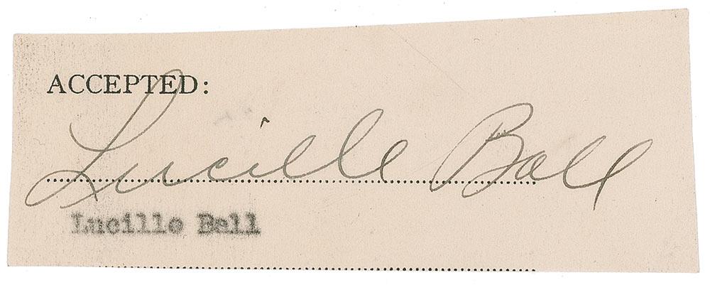 Vintage ink signature, “Lucille Ball,” on an off-white 3.75 x 1.5 slip clipped from a larger document. In fine condition, with slightly irregular edges.