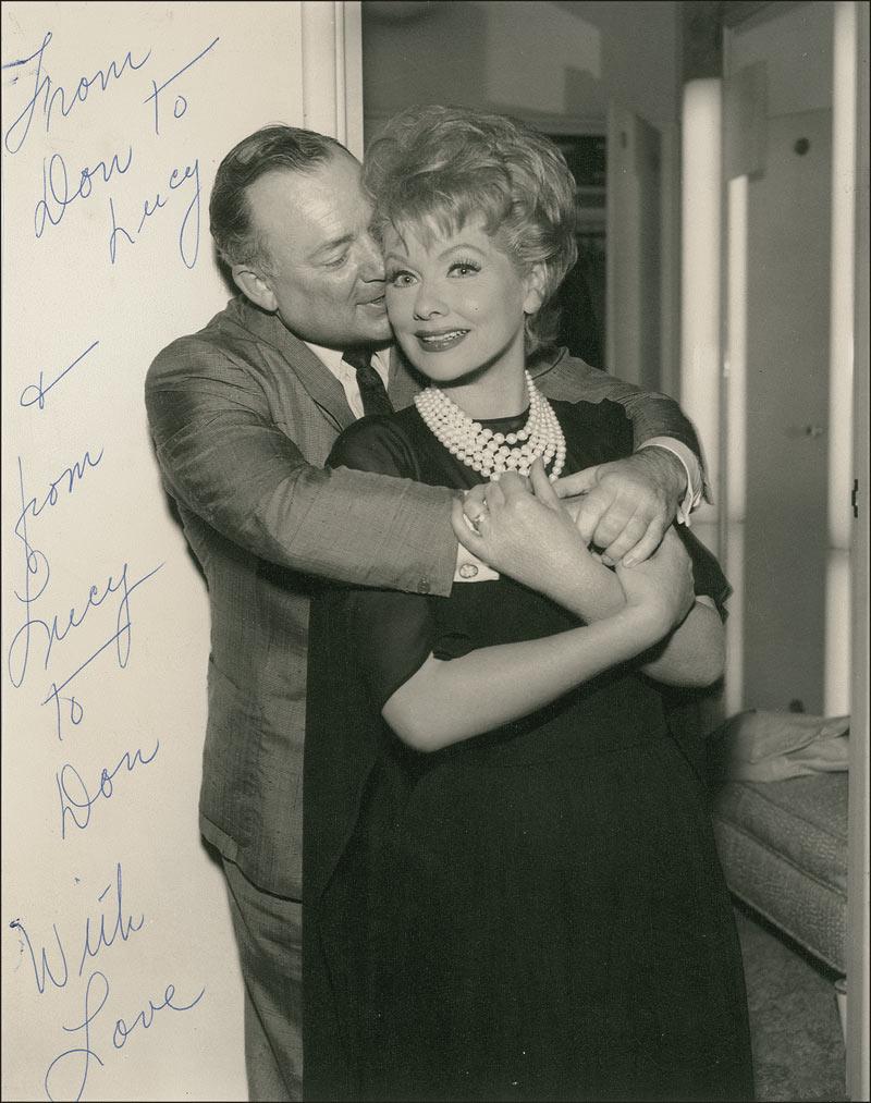 Vintage matte-finish 7.25 x 9.5 photo of Lucy in the arms of a man, signed and inscribed in blue ballpoint to her agent Don Sharpe, “From Don to Lucy & from Lucy to Don With love.” In fine condition, with lightly trimmed edges, a couple trivial surface creases, and a few stray ink marks.
