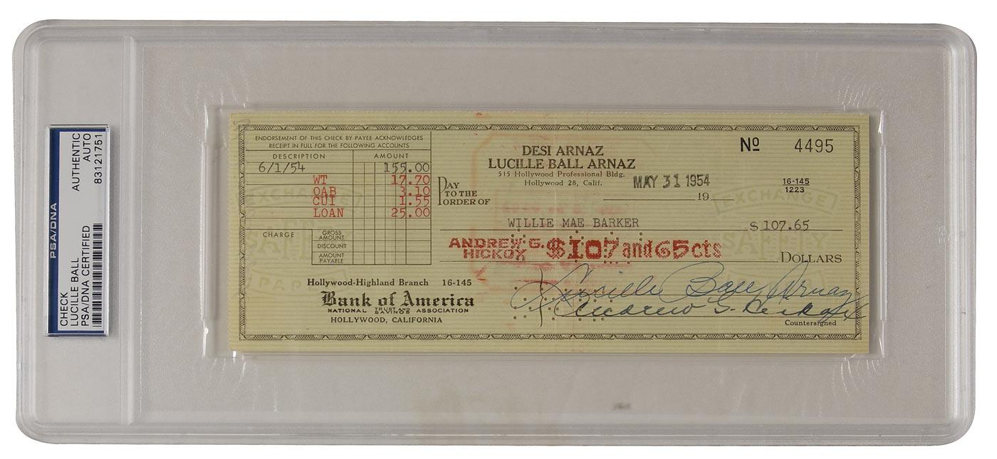 Personal check, 8.25 x 3, filled out in type and signed by Ball, “Lucille Ball Arnaz,” payable to Willie Mae Barker for $107.65, stamp-dated May 31, 1954. Encapsulated in a plastic PSA/DNA authentication holder. Two vertical folds, one through a single letter of signature, cancellation holes lightly affecting first name of signature, and expected stamps, otherwise fine condition.