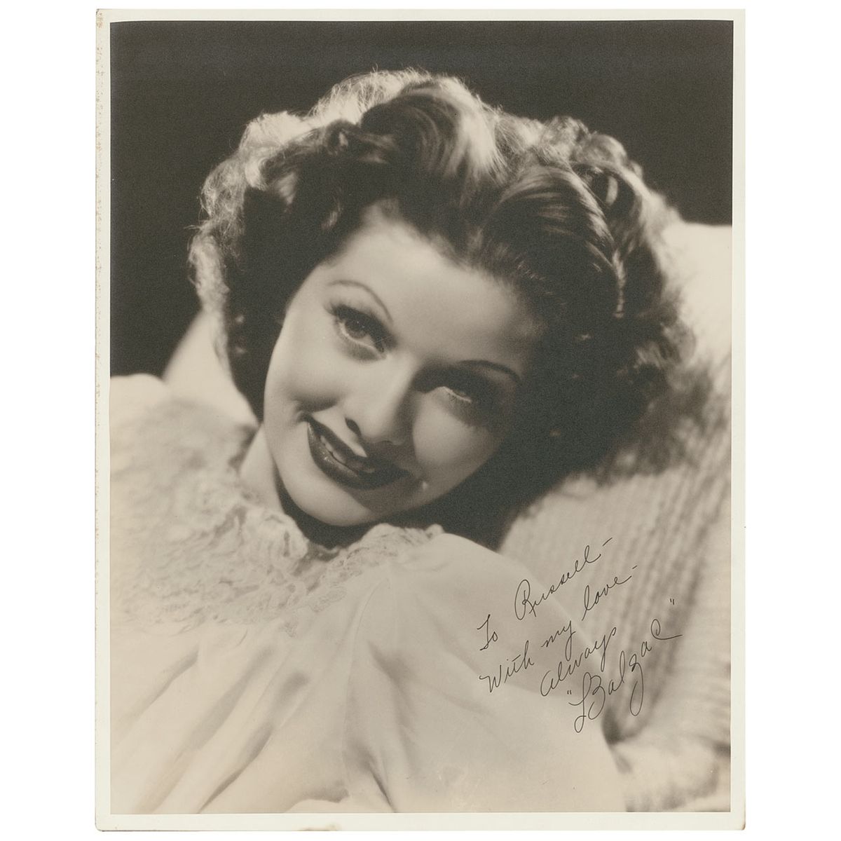 Beautiful vintage matte-finish 11 x 14 close-up photo of Ball signed and inscribed in fountain pen, “To Russell—With my love—Always, ‘L Balzac.’” Scattered light toning to the edges with some foxing along the left edge, and light silvering to some of the darker areas of the image, otherwise fine condition.