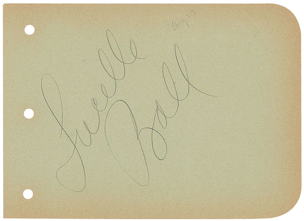 Vintage pencil signature, “Lucille Ball,” on a light green 6 x 4.5 album page. In fine condition, with some mild edge toning.