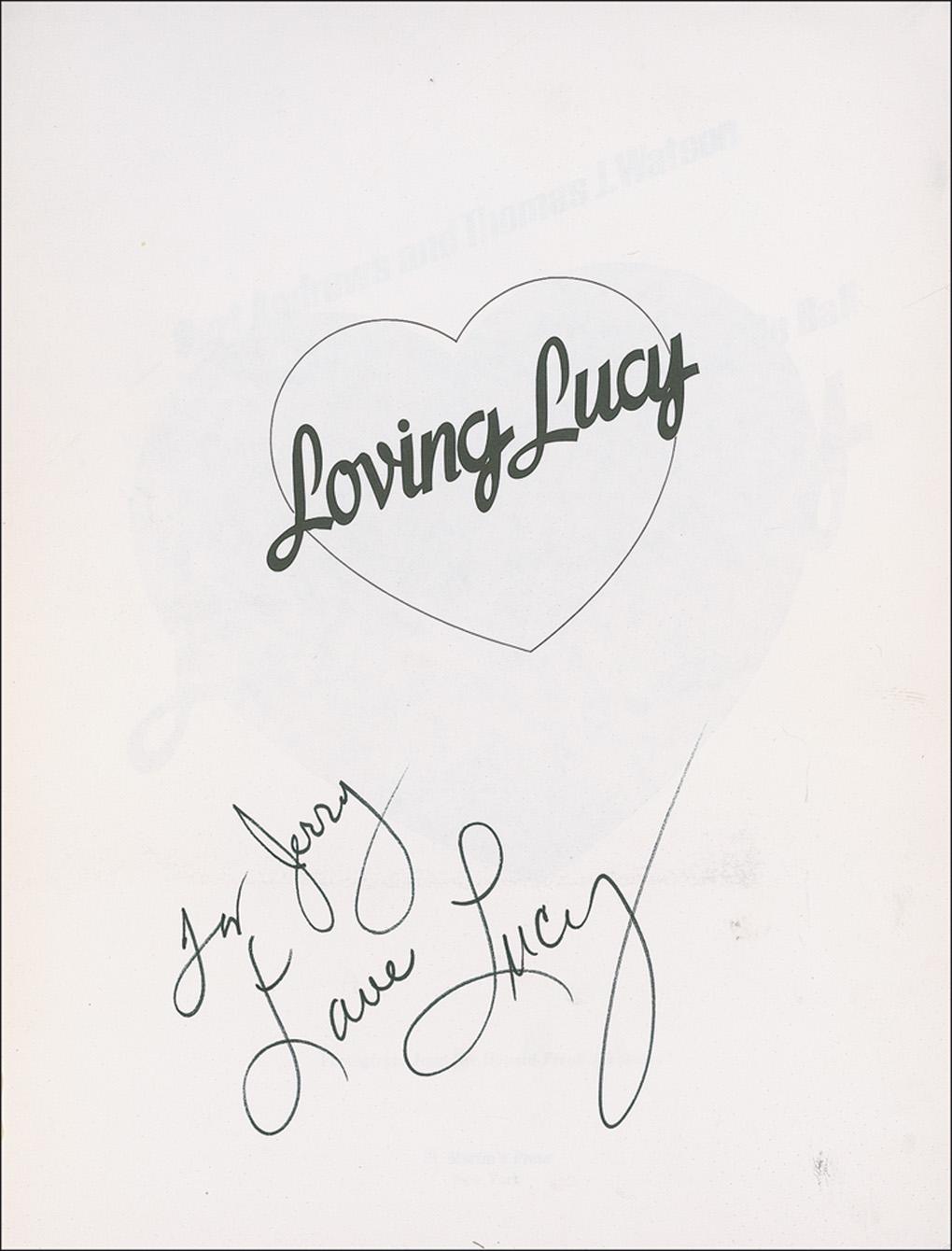 Signed book: Loving Lucy. First edition. NY: St. Martin’s Press, 1980. Softcover, 8.25 x 11, 226 pages. Signed and inscribed on the half-title page, “For Jerry, Love, Lucy.” In fine condition, with missing front end page, scattered wear, surface marks, and creasing to covers, and small tear to back cover.