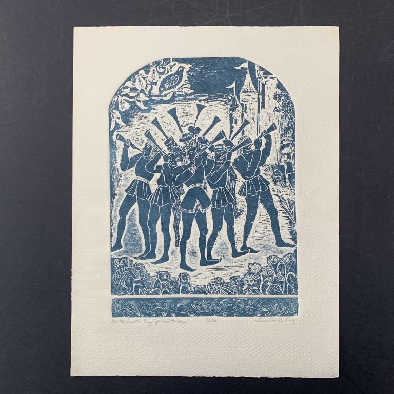 Lucille Gilling's "On the Tenth Day of Christmas" Limited Edition Etching. Ten minstrals, blowing their horns to mark the upcoming Christmas festivities. This piece is done in blue and is signed on the lower right, titled on the lower left and numbered 7/50 in the lower middle