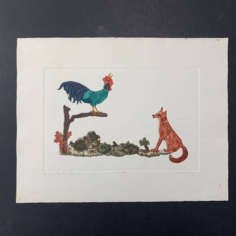Lucille Gilling's "The Nun's Priest's Tale" Limited Edition Etching. The rooster crows on a branch as the fox licks his lips. It is signed in the lower right, titled in the lower left and numbered AP VII in the lower middle