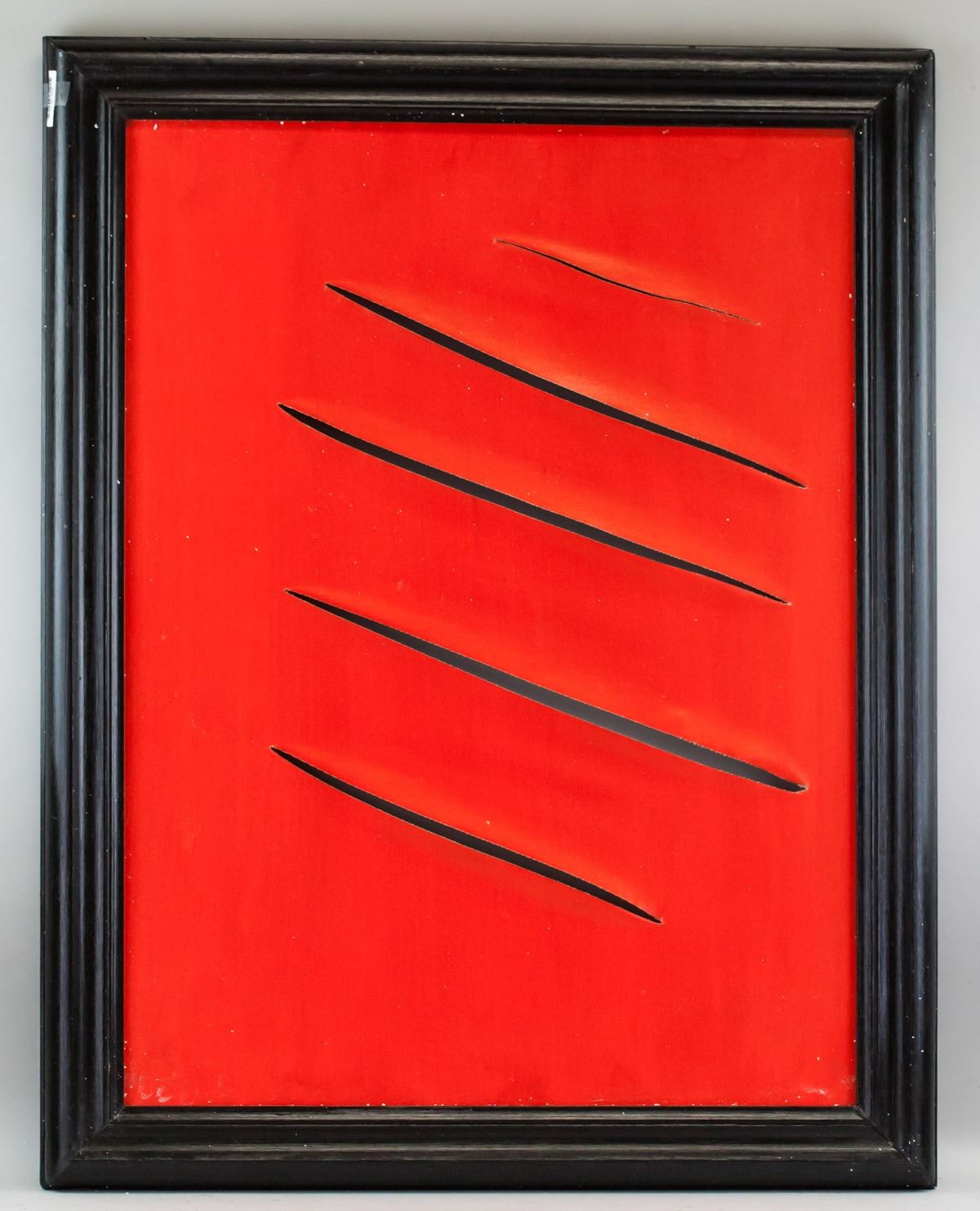 Oil on canvas, framed. Featuring an abstract expressionist composition. Attributed to Lucio Fontana (1899-1968, Argentinian-Italian). 60.9 x 81.3 cm (24 x 32 inches). Framed size: 74 x 91.4 cm (29 x 36 inches). PROVENANCE: Private Canadian collection