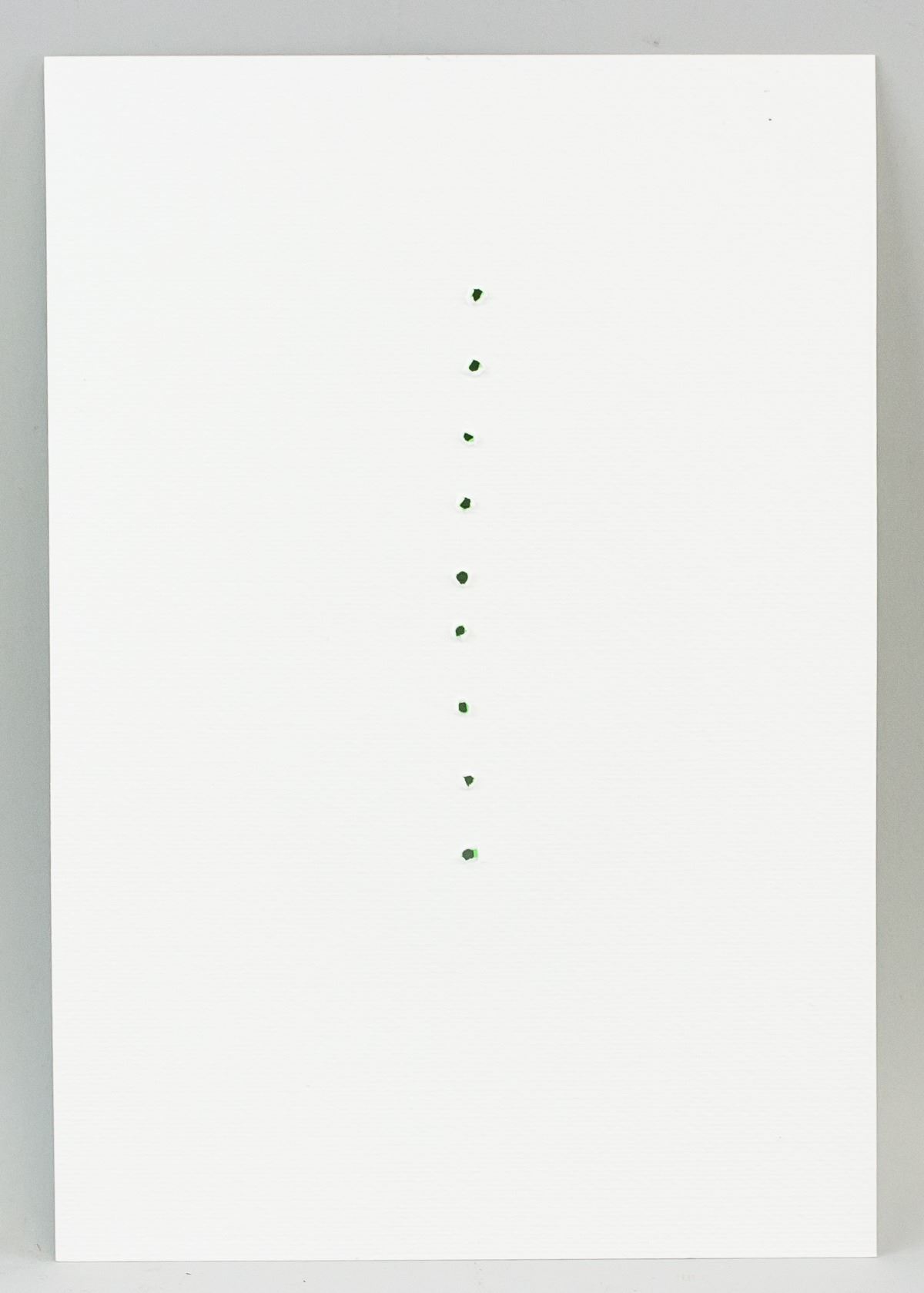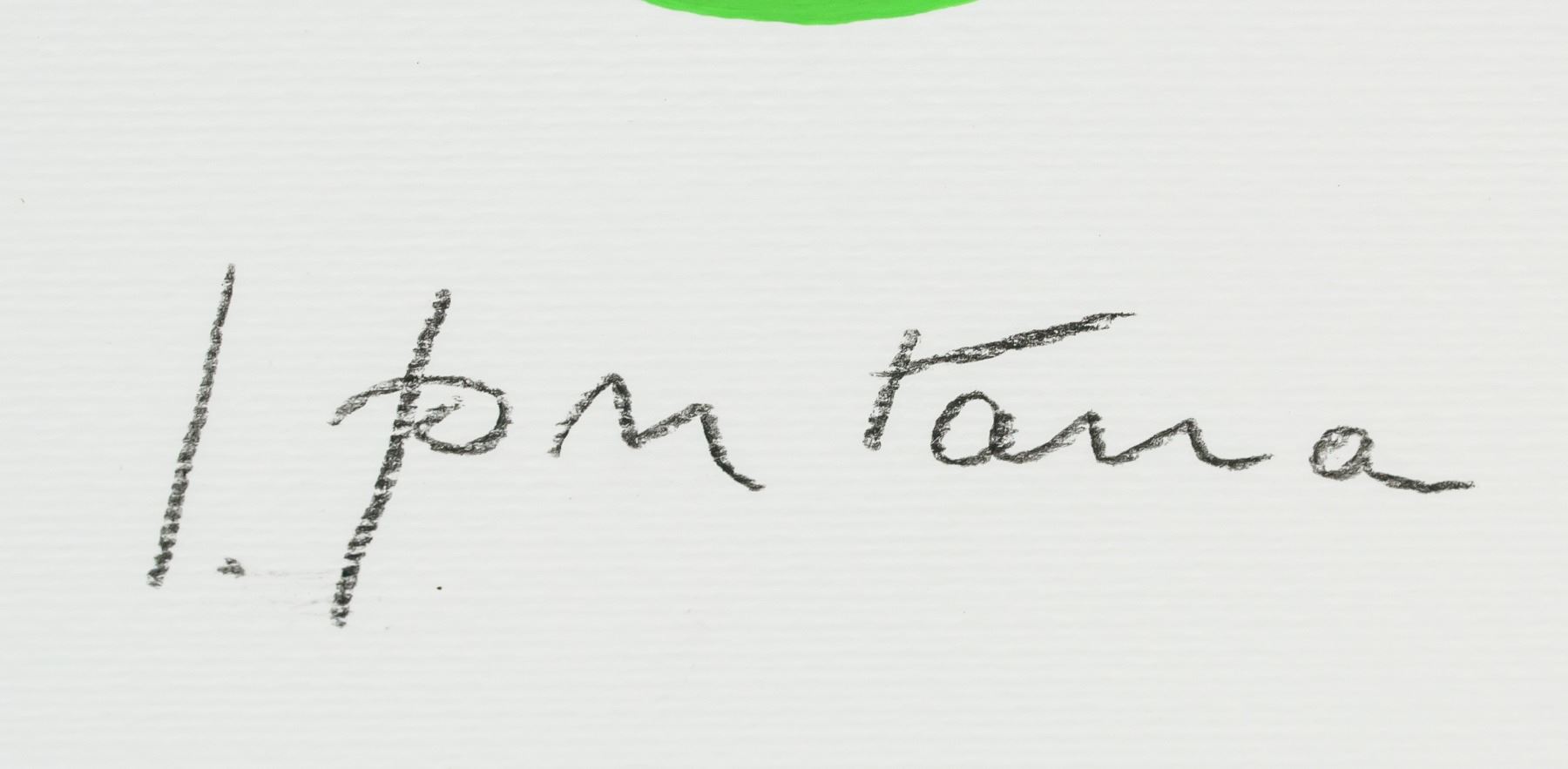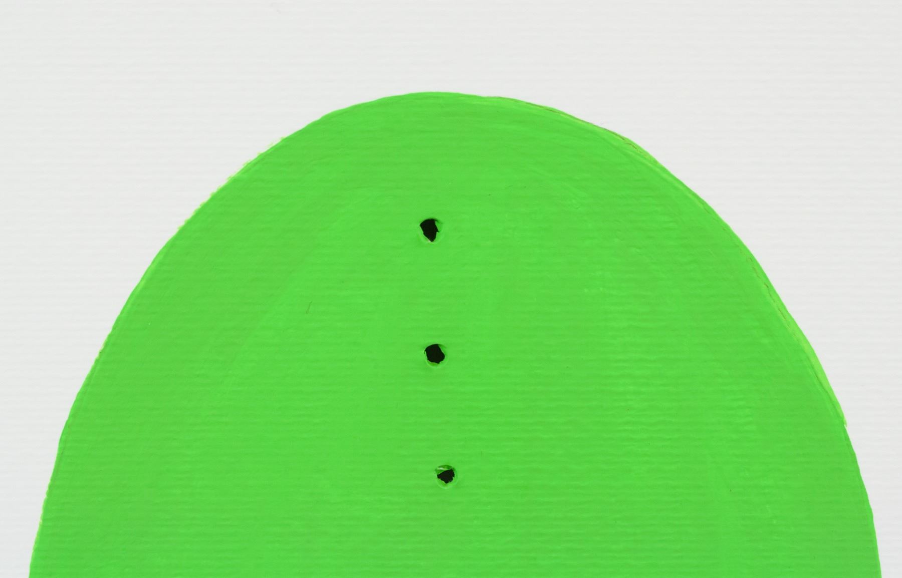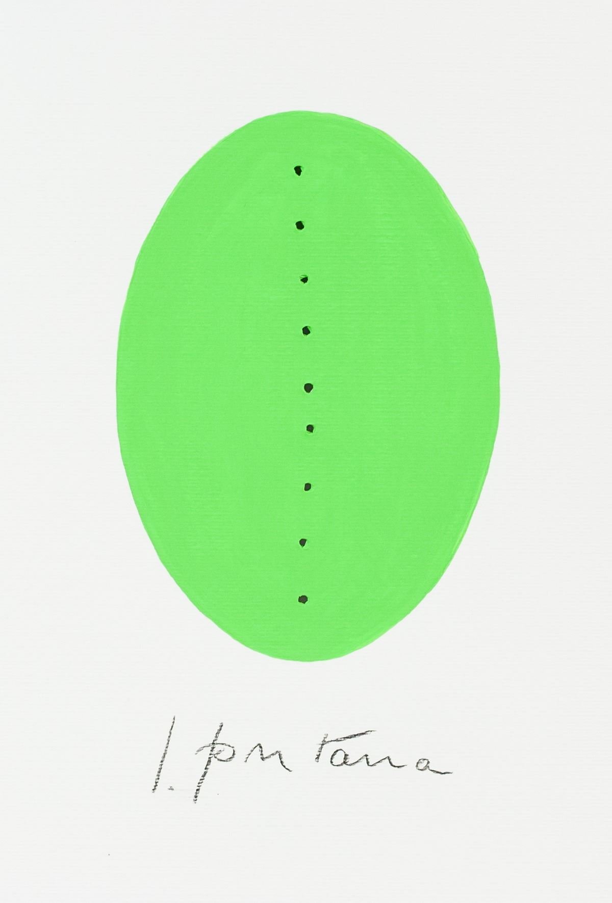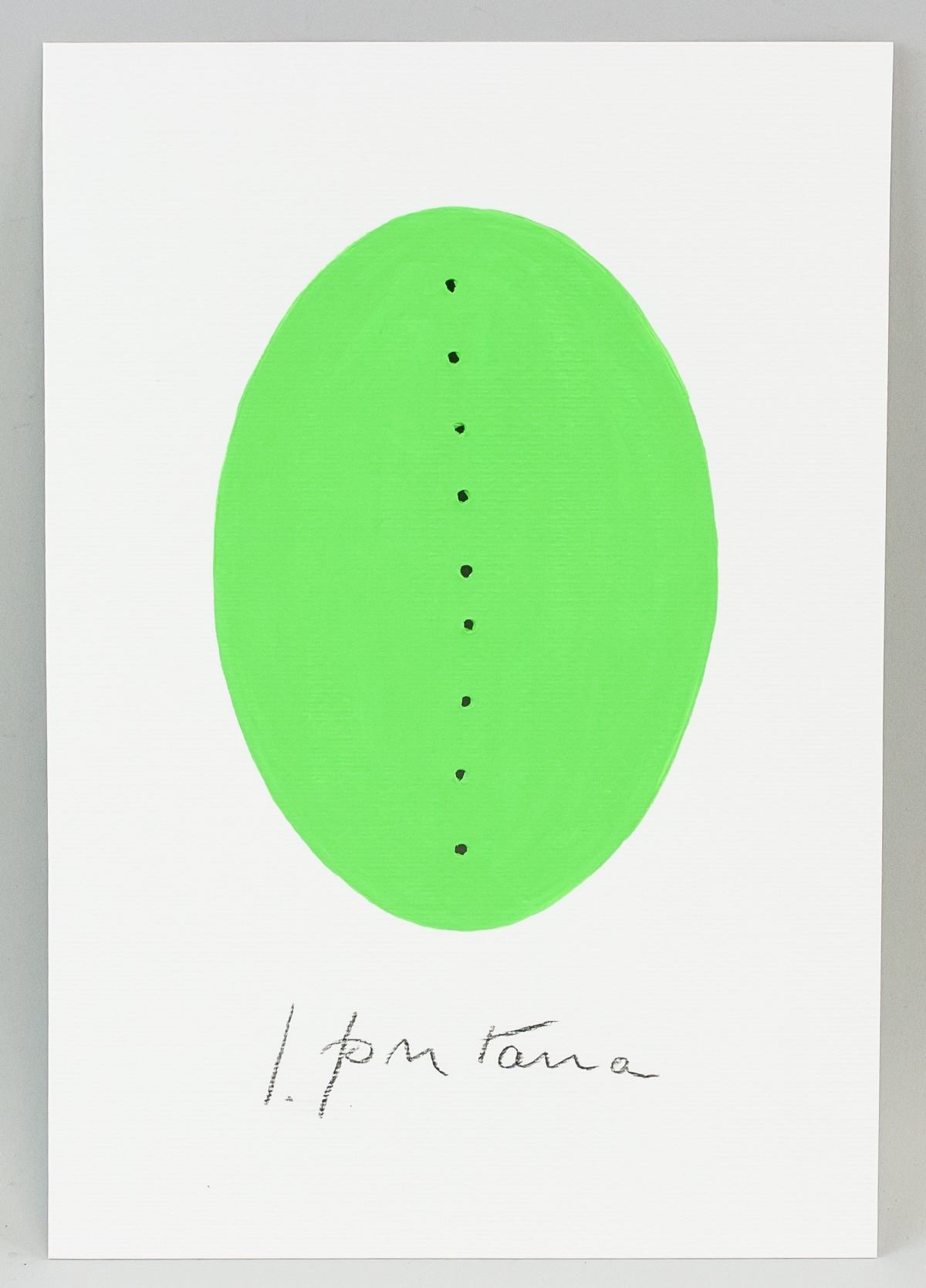 Gouache on paper. Featuring a green oval with a vertical row of holes poked through. Signed "l. Fontana" beneath the image. Attributed to Lucio Fontana (1899-1968, Argentinean-Italian). 33 x 23 cm (12.5 x 9 inches). Provenance: This lot carries limited provenance from a Southern Ontario estate.