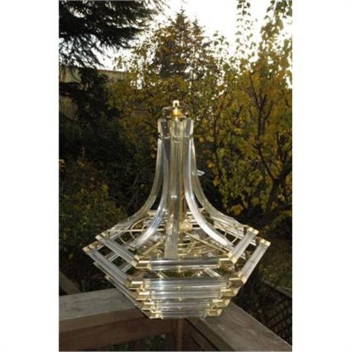 Large beveled Lucite and brass chandelier. It is 24" high and a maximum of 22" wide. The curved vertical sections are attached at the top and free swinging at the bottom. <p> It needs to be cleaned up and the brass polished up a bit. It has been sitting in my unheated shed for a time. There is just one small brass decorated screw cap that is missing from the top of one of the vertical pieces but that can easily be replaced. <p> It has not been tested. But there appears to be no reason I would not work fine. It is very heavy. Clean up and it will look fabulous. <P>