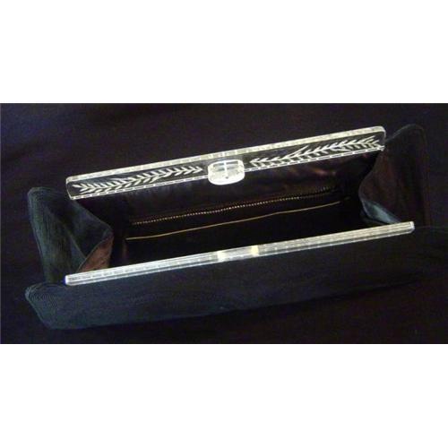 American. Clear lucite hand-etched frame with black crocheted body. Black satin interior with four pockets and separate zipped compartment. Larege enough to hold all your essentials including cell phone and blackberry. In pristine original condition. Fabulous!