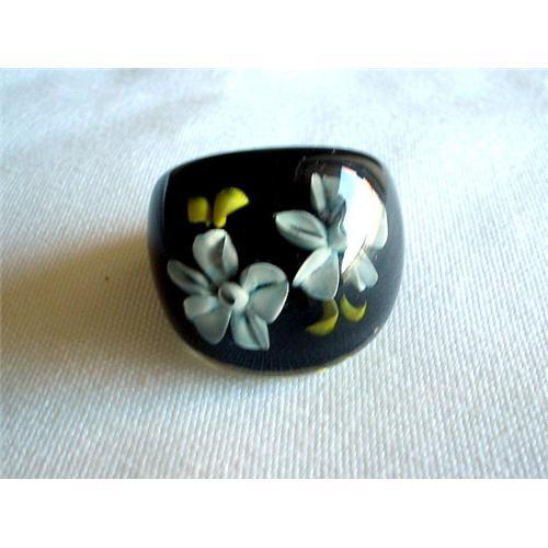 Probably one of the most unique and beautiful Lucite rings you will ever come across. I can understand the new frenzy in the collecting of these gorgeous retro rings. A velvety black band wraps around to meet a raised domed center that has reverse carved flowers of a soft blue gray accented by olivine color leaves. Very comfortable to wear and in very excellent condition, no flaws. Size 8.