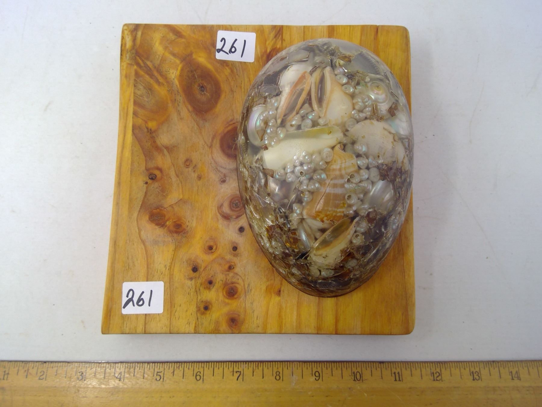 Lucite, Seashells, Wood Sculpture "Moon Face" - Height 8"