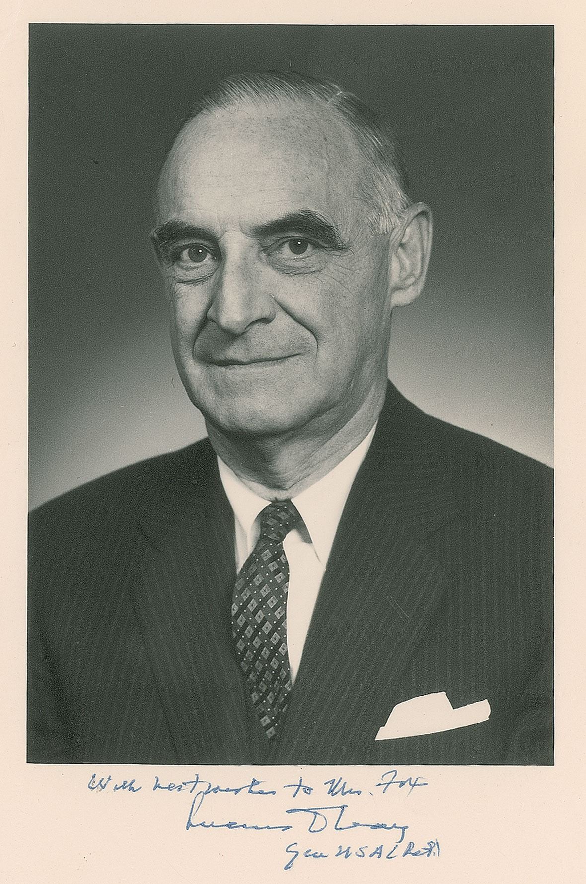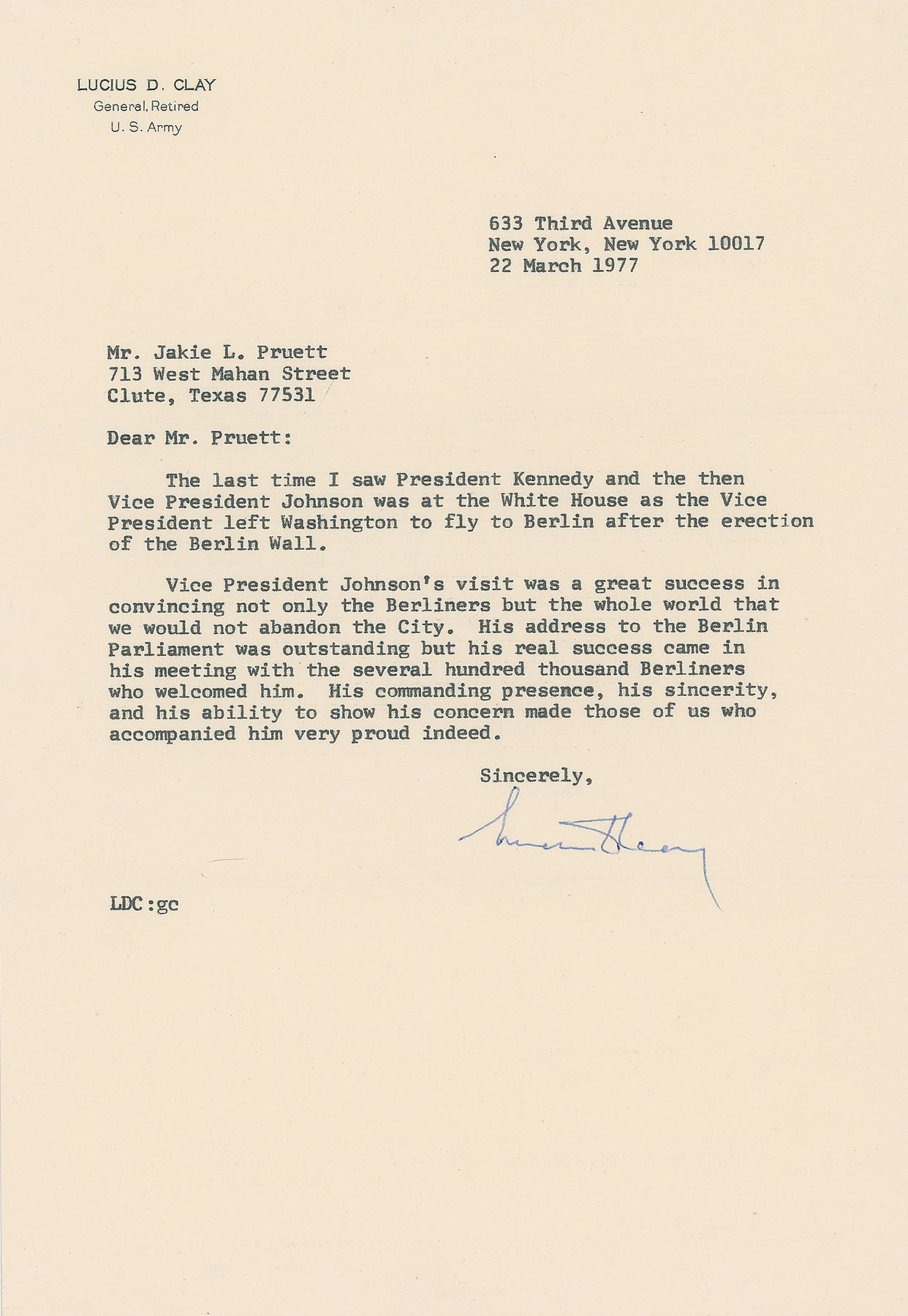 Two items: a vintage matte-finish 4.75 x 7 photo of Clay in a head-and-shoulders pose, signed and inscribed in the lower border in black ballpoint, "With best wishes to Mrs. Fox, Lucius D. Clay, Gen. USA (Ret.)"; and a TLS, signed "Lucius D. Clay," one page, 7.25 x 10.5, personal letterhead, March 22, 1977, addressed to Jakie L. Pruett, in full: "The last time I saw President Kennedy and the then Vice President Johnson was at the White House as the Vice President left Washington to fly to Berlin after the erection of the Berlin Wall. Vice President Johnson's visit was a great success in convincing not only the Berliners but the whole world that we would not abandon the City. His address to the Berlin Parliament was outstanding but his real success came in his meeting with the several hundred thousand Berliners who welcomed him. His commanding presence, his sincerity, and his ability to show his concern made those of us who accompanied him very proud indeed." In overall fine condition.