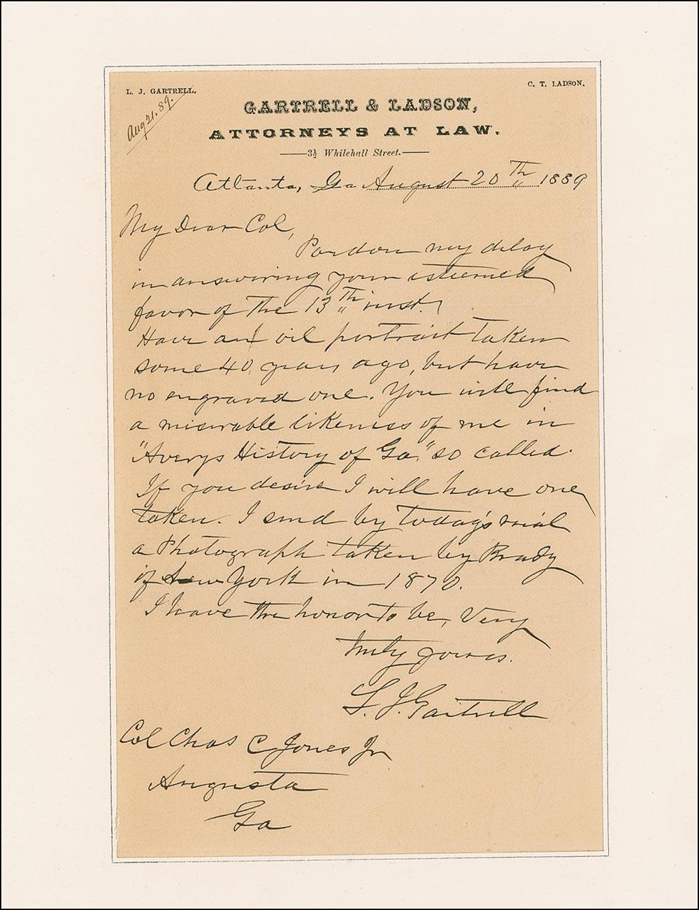 American politician and lawyer, as well as general in the Confederate States Army during the Civil War. ALS signed “L. J. Gartrell,” one page, 6 x 9.25, Gartrell & Ladson, Attorneys at Law letterhead, August 20, 1889. Letter to Colonel Charles Jones. In part: “Have an oil portrait taken some 40 years ago, but have no engraved one. You will find a miserable likeness of me in ‘Averys History of Ga.,’ so called. If you desire I will have one taken. I send by today’s mail a photograph taken by Brady of New York in 1879.” Letter has been professionally inlaid to a slightly larger off-white sheet In fine condition, with a uniform shade of mild toning.