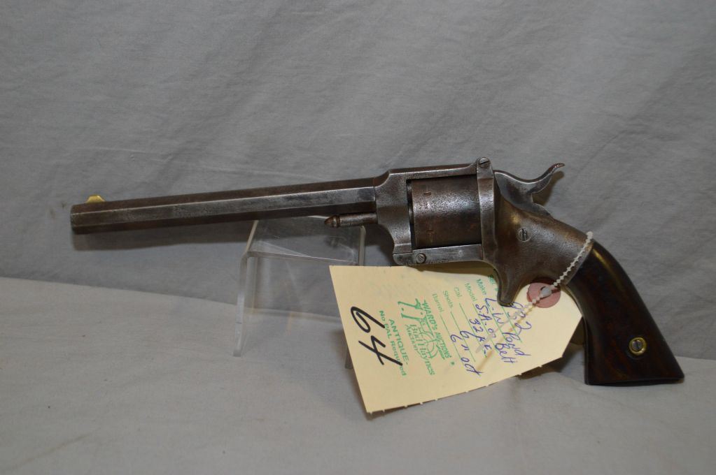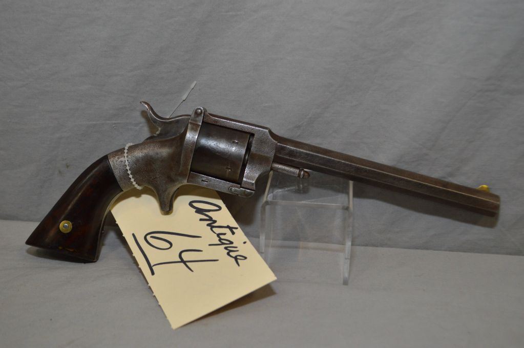 Lucius W. Pond Model S.A. or Belt ( Iron Framed Pond ) .32 Rimfire Cal 6 Shot Revolver w/ 6" octagon bbl [ fading blue finish turning brown, walnut grips, small round button latch the left forward frame, releases the barrel and flip barrel up to load, hinged at the rear of top strap, where it joins the shield, spur trigger, square butt, missing the small screwdriver that would fit into the underside of the butt, barrel marked L.W. Pond, Worchester, Mass., PAT'D July 10, 1860, Estimated Production of several thousand, Pre Smith & Wesson marked, Circa 1861 - 1870 ] Ser # 932 ANTIQUE NO PAL REQ