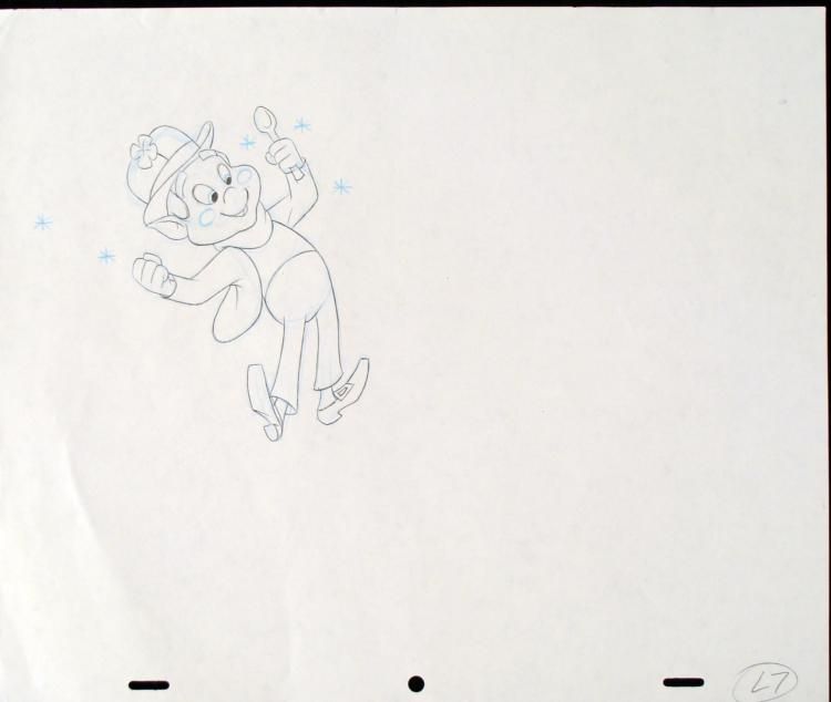 An advertising company employed by General Mills and Company suggested revolving the marketing of the new cereal around the idea of charm bracelets. Thus, the charms of Lucky Charms were born. The mascot, Lucky the Leprechaun (originally called L.C. Leprechaun), * created in 1963, is a cartoon character whose voice was supplied by Arthur Anderson until 1992. * * * * * Look kids, Lucky Charms make you big and strong, so why you buy a box today! * * * Original "rough" animation drawing, in non-photo blue and black with the notations in black.Overall size is a 12-field drawing that is 10 1/2" × 12 1/2"Very Good Condition; creased left corner * * * Traditional animation is a multi-step process which includes various types of art techniques. Drawings are a key part of the process, in which the animator creates the design and movement of the characters. Drawings are then transferred onto acetate cels * (by hand-inking and/or photo copying) to create a production cel, which is then hand painted on the back side, using paint colors chosen and approved by the creator of the series. * * * The drawing is ready to be matted and framed. The animators notations are located at the bottom of the drawing. *