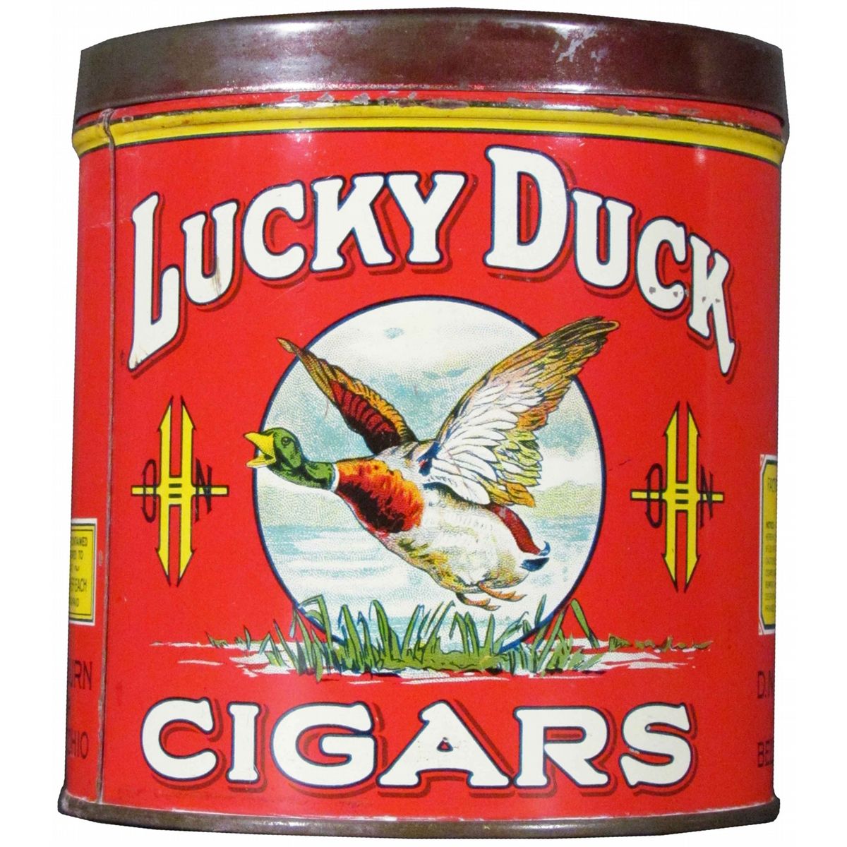 Lucky Duck Cigars Tin for 50 Cigars. D.N. Hepburn Maker, Belmont, Ohio. The Meekin Can Co. Cin. O. Excellent condition. 5 inch diameter X 5 1/4 inches tall.