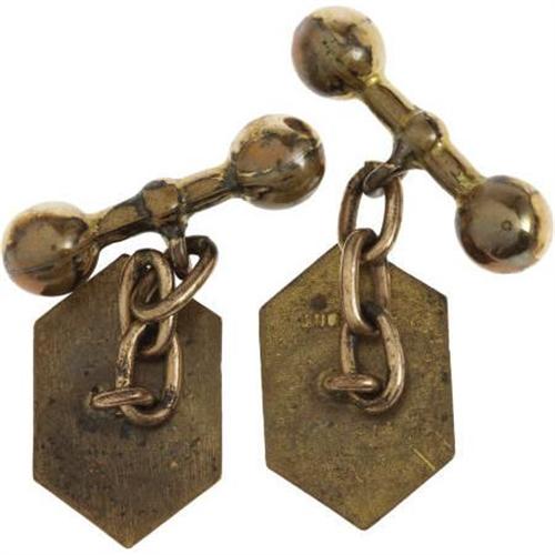 <B>Lucky Luciano Owned Gold Cufflinks.</B></I> A pair of gold hexagonal cufflinks (not props), each engraved with a letter "L," owned and worn by the infamous gangster himself. In Very Fine to Excellent condition. <I> Accompanied by COA from L.A. Prop and Wardrobe Co.</B></I><BR><BR><b>Shipping:</b> Clothing, Costumes & Jerseys (<a target="_blank" href="http://www.heritageauctions.com/common/shipping.php">view shipping information</a>)
