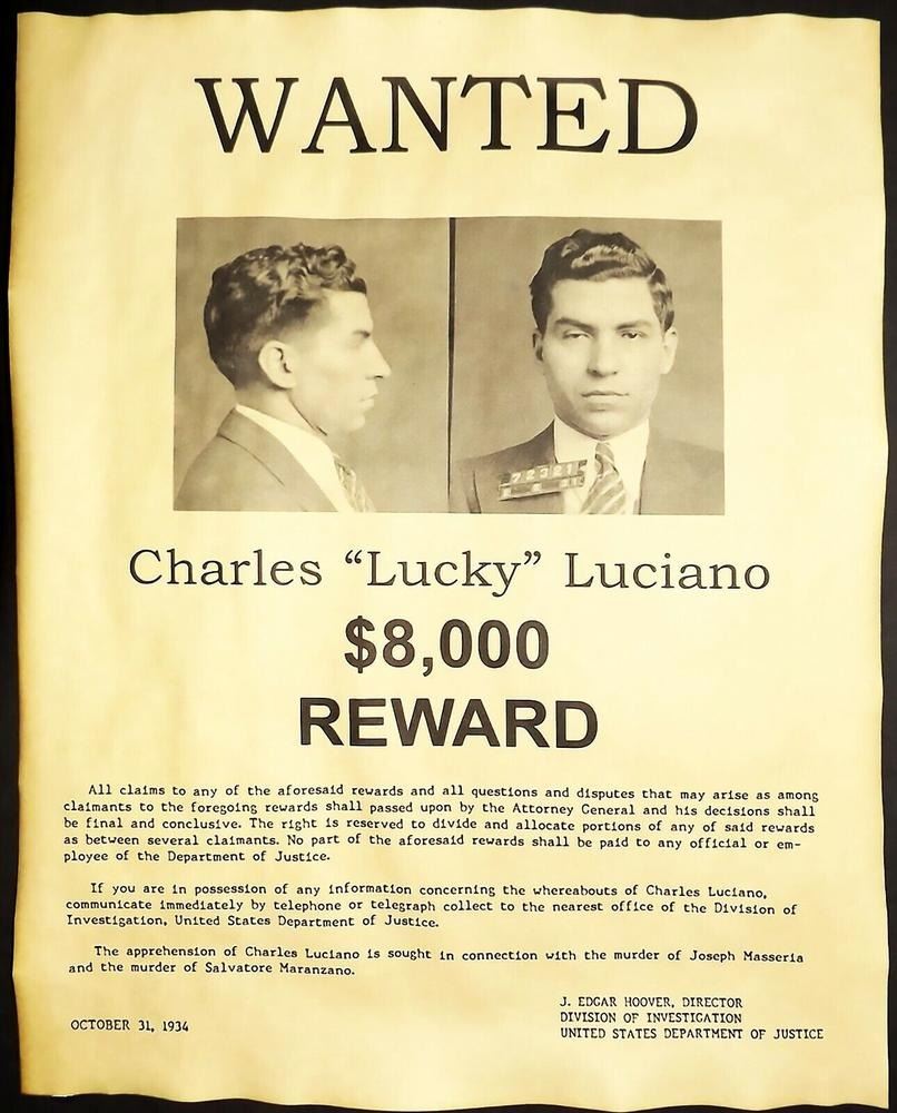 Charles "Lucky" Luciano was an Italian-born gangster who operated mainly in the United States. Luciano started his criminal career in the Five Points gang and was instrumental in the development of the National Crime Syndicate. 8 x 10 inch