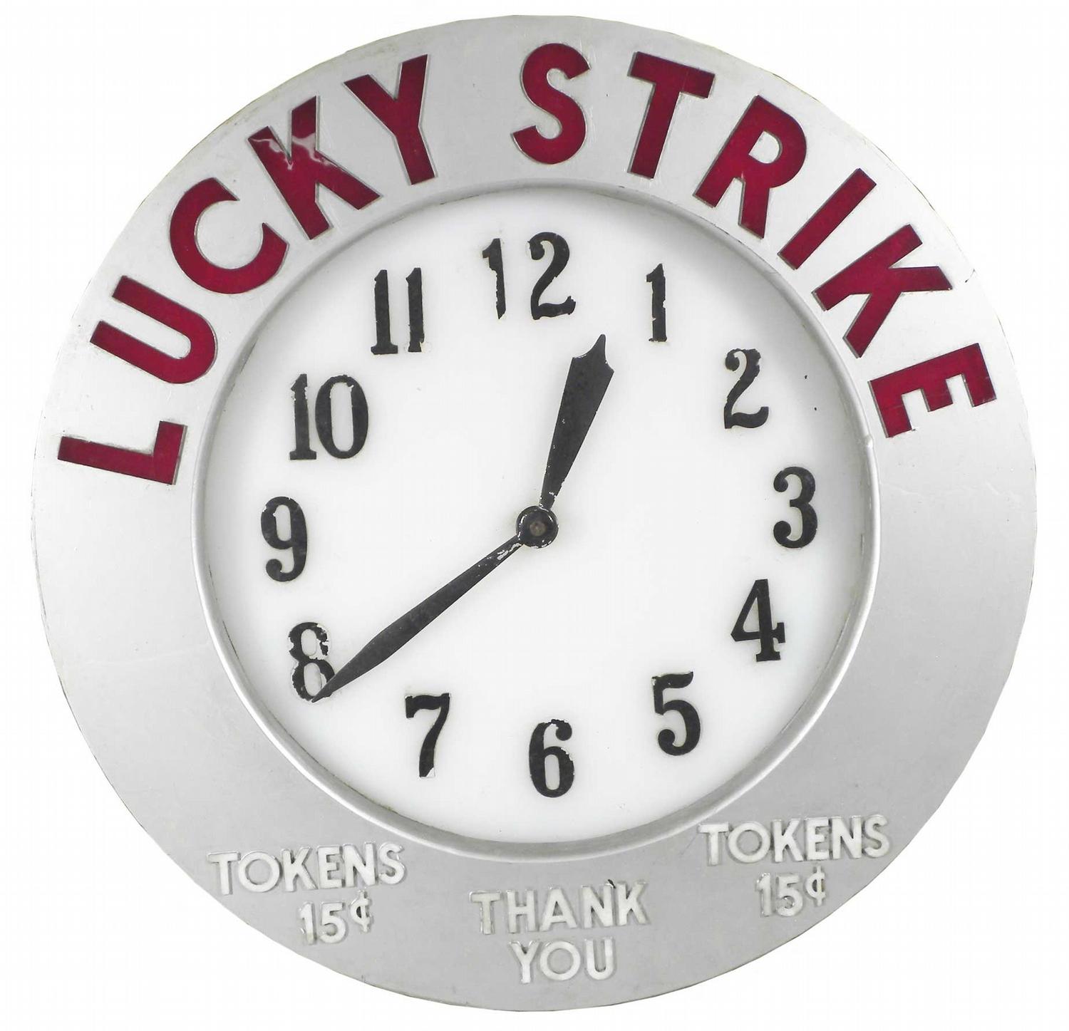 Lucky Strike Cigarette Light Up Clock. "Tokens 15 Cents". Very good, non-working condition. 18 inch diameter.