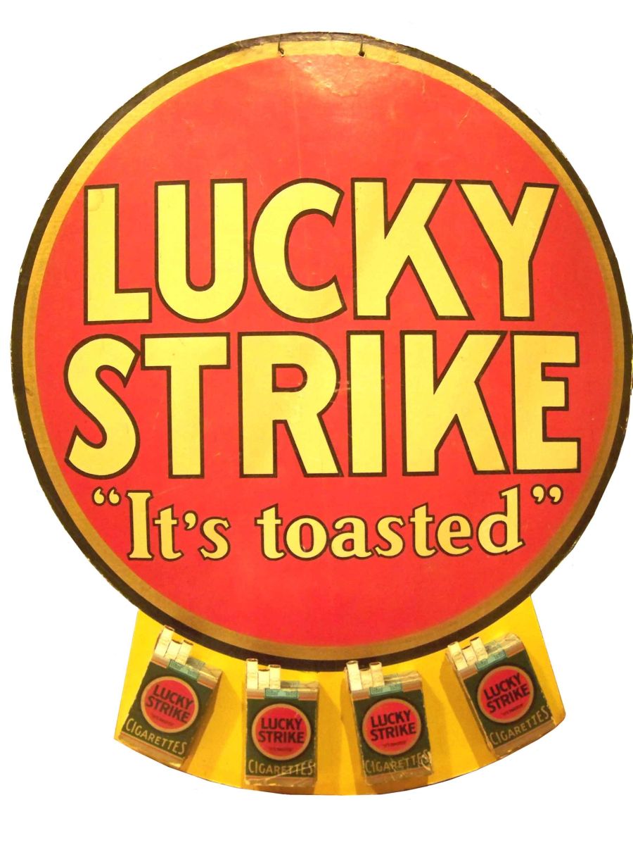 Very Rare Lucky Strike Cigarettes Cardboard Dimensional Counter Display Sign. Patent 1931. Bright colors with four display packs, excellent condition. 23 inches tall X 19 inches wide.