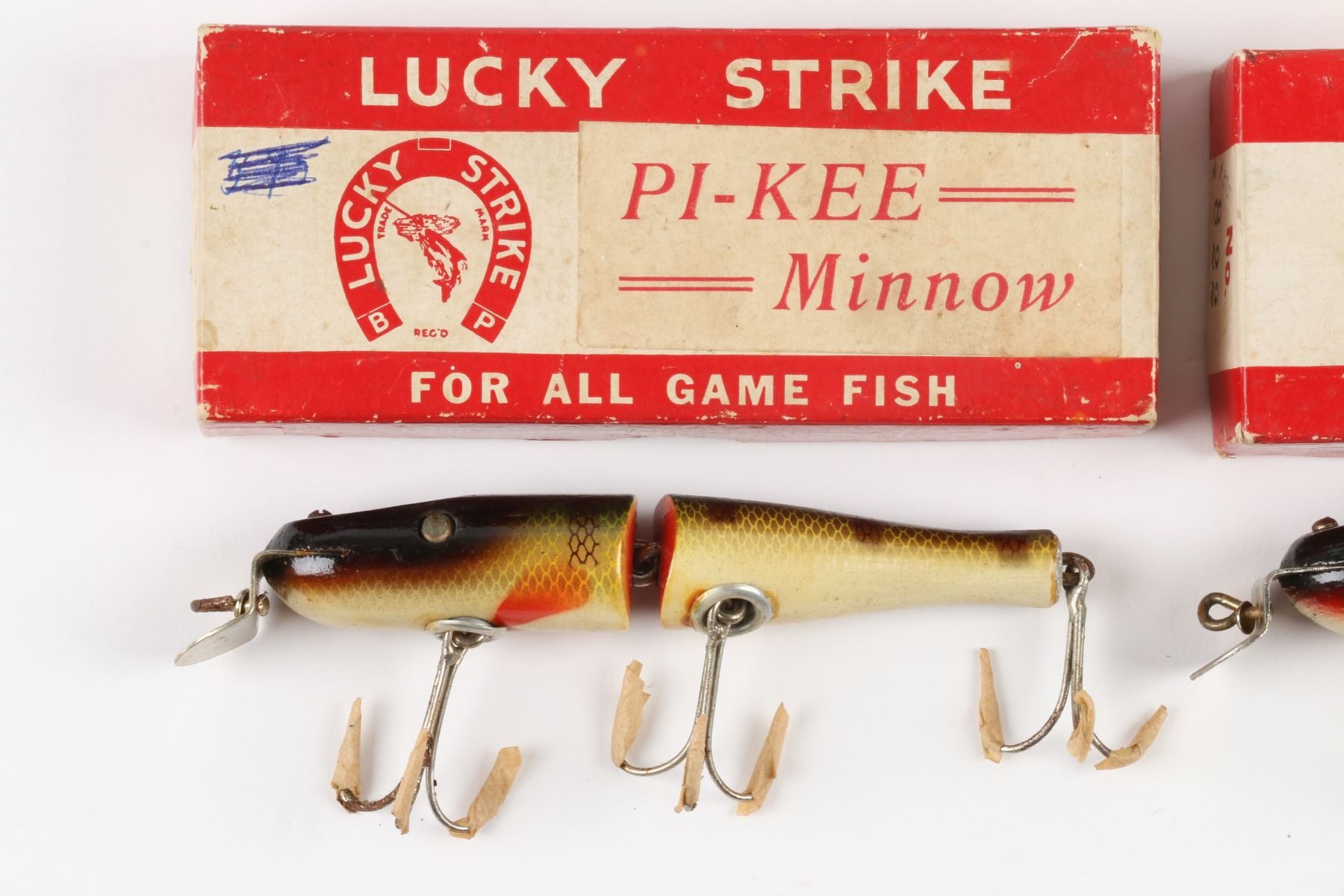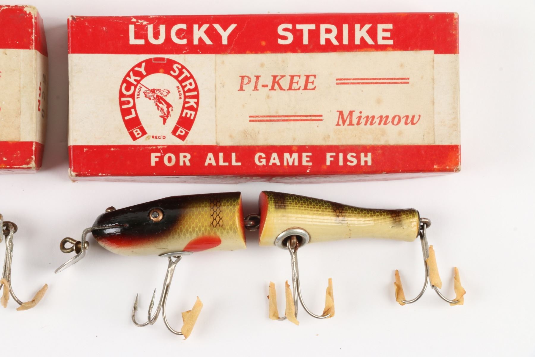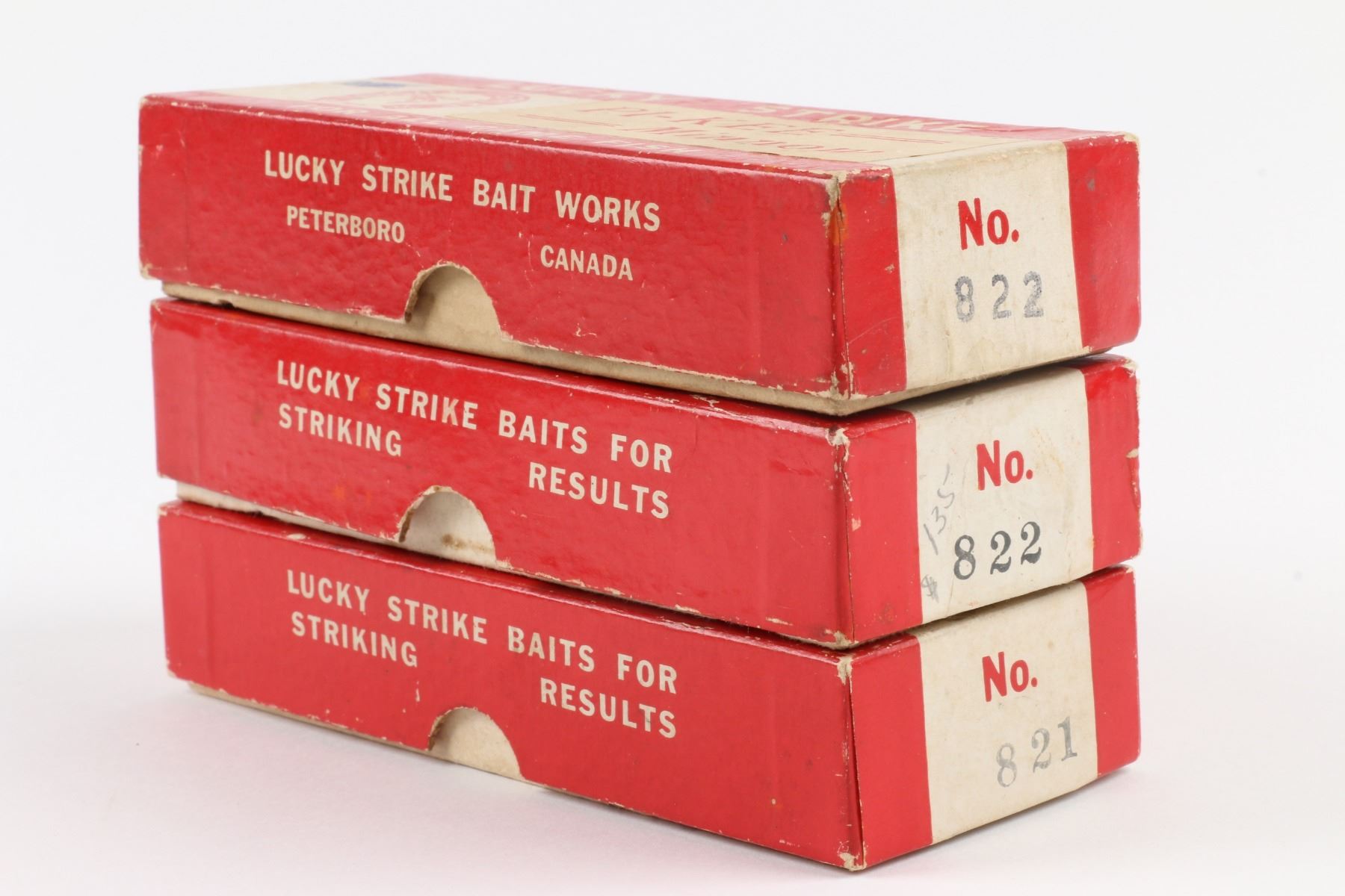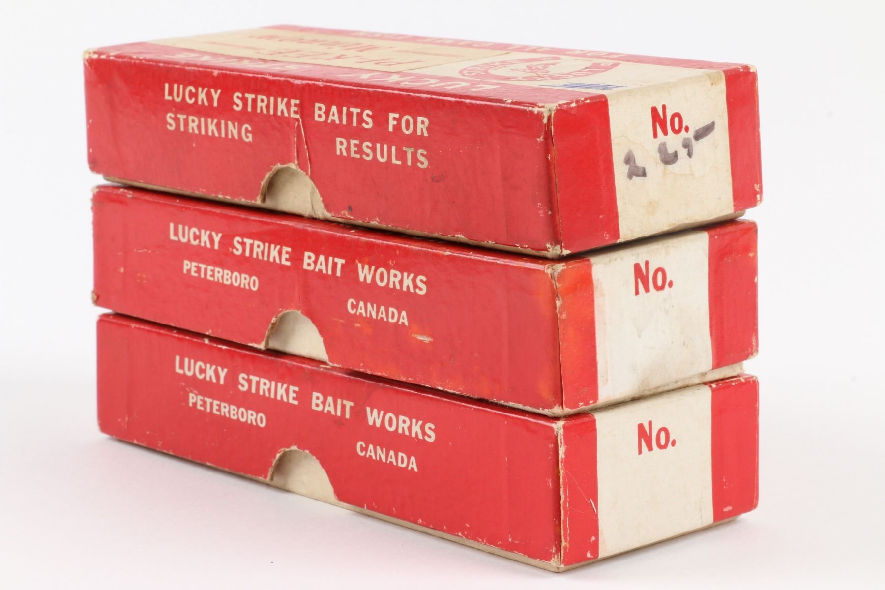 Lucky Strike Bait Works, Canada. 1950s. Material: Wood. Quantity: 3. Grade: VG. 5.25" boxes. Est. $75-100.