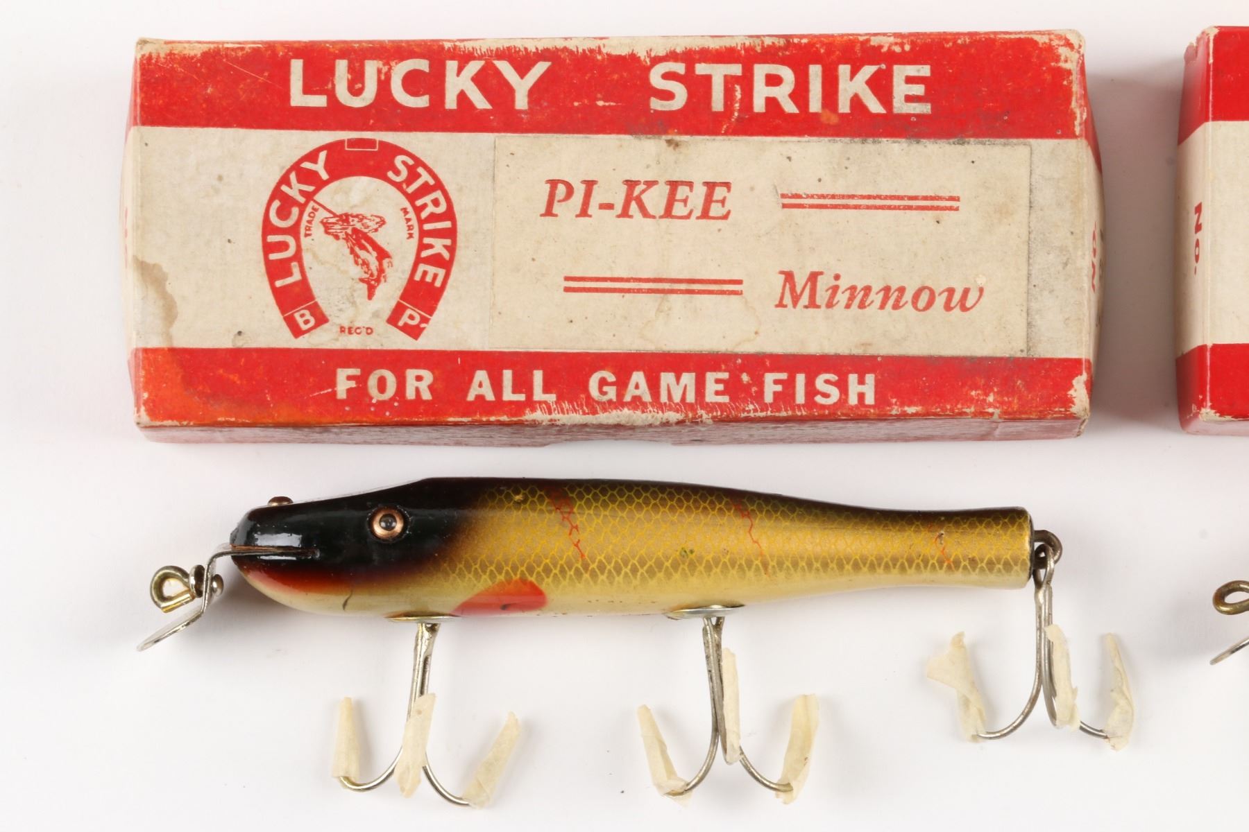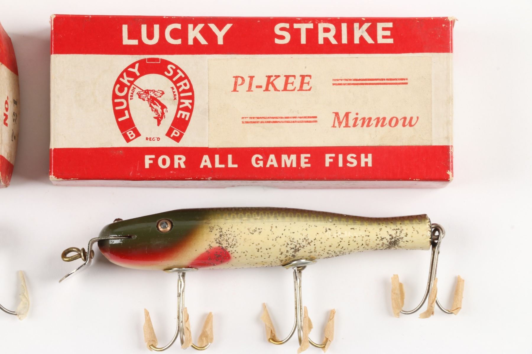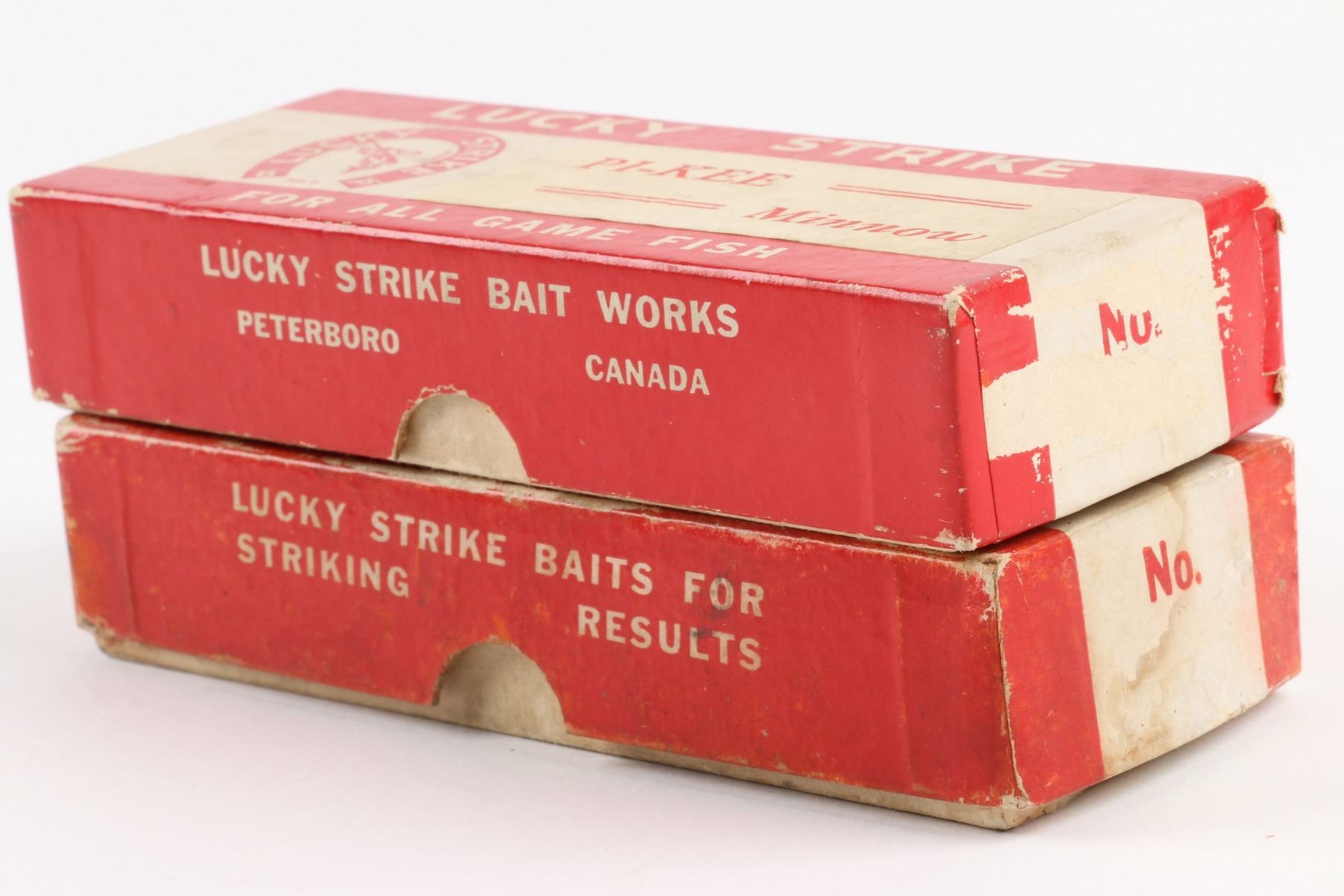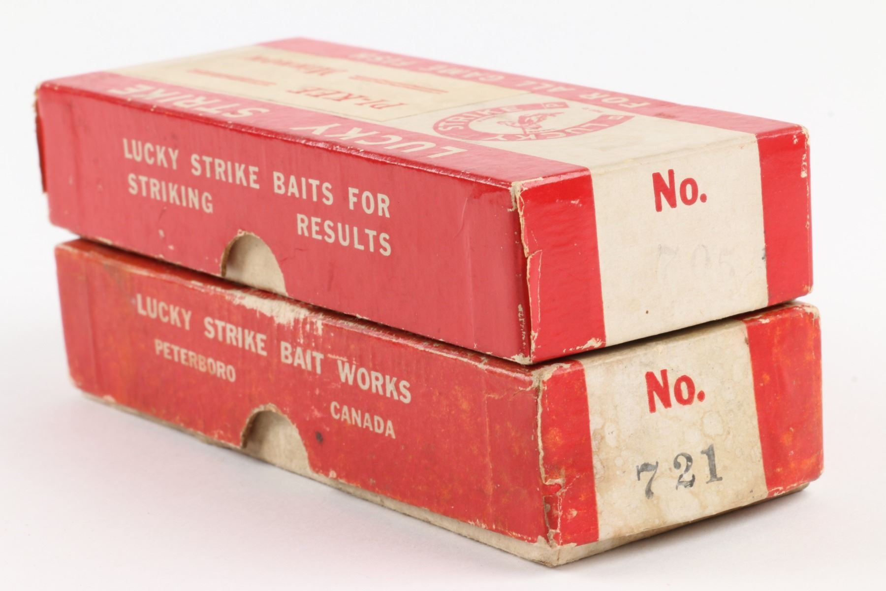 Lucky Strike Bait Works, Canada. 1950s. 2 Boxed. Material: Wood. Quantity: 3. Grade: VG+. 5.25" boxes. Est. $100-125.