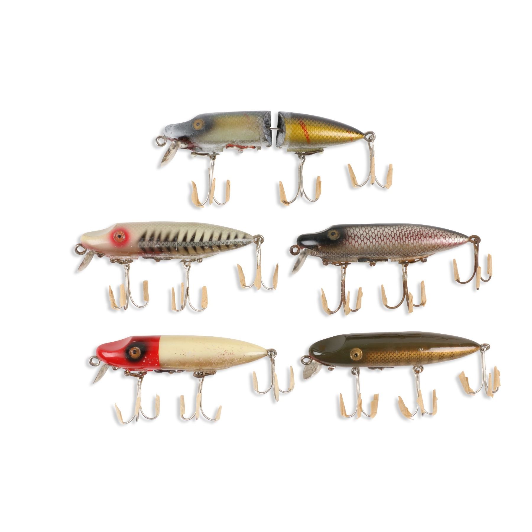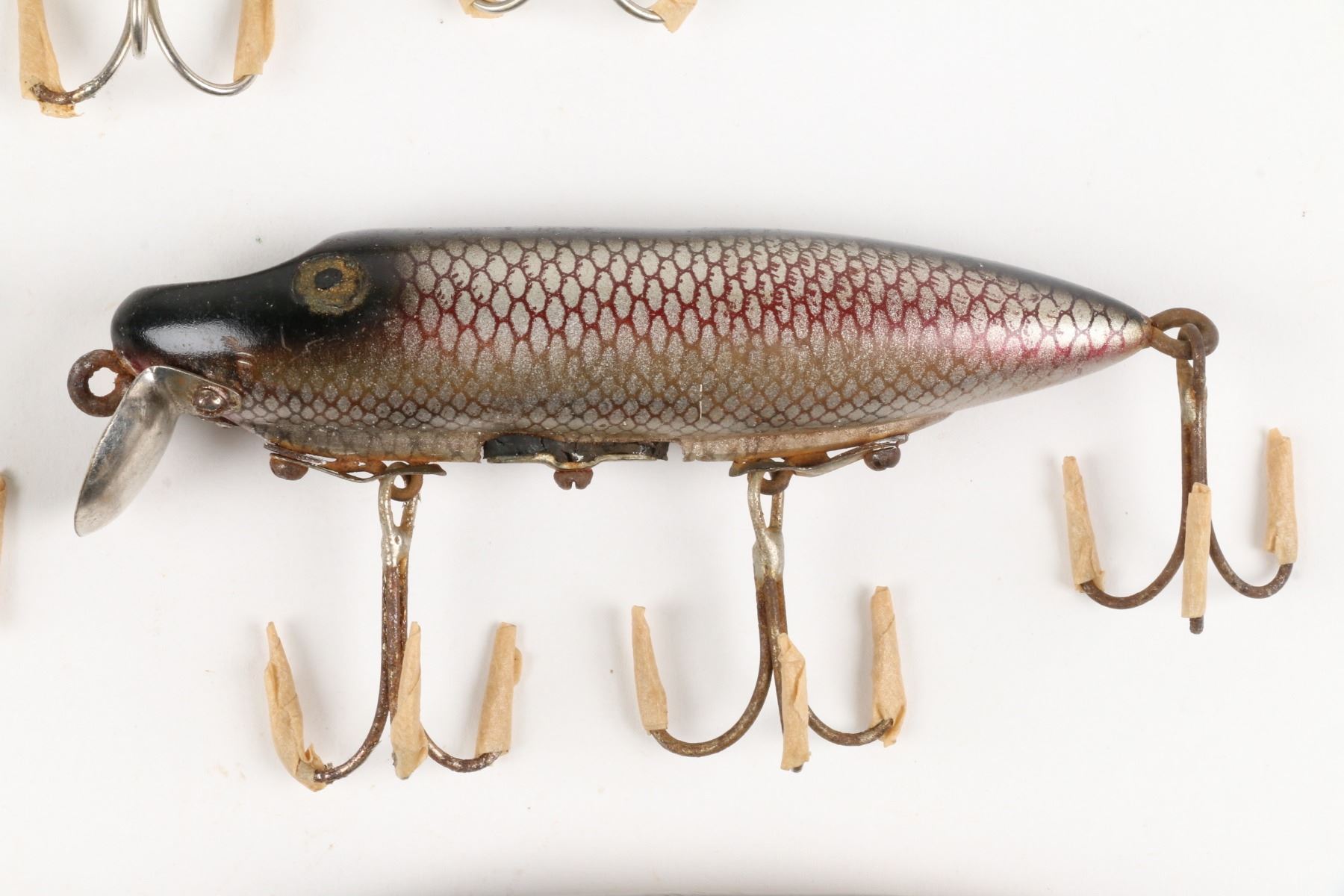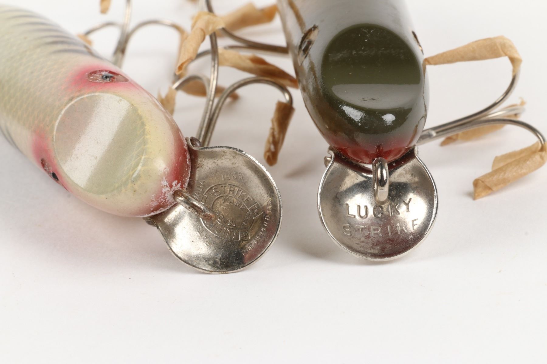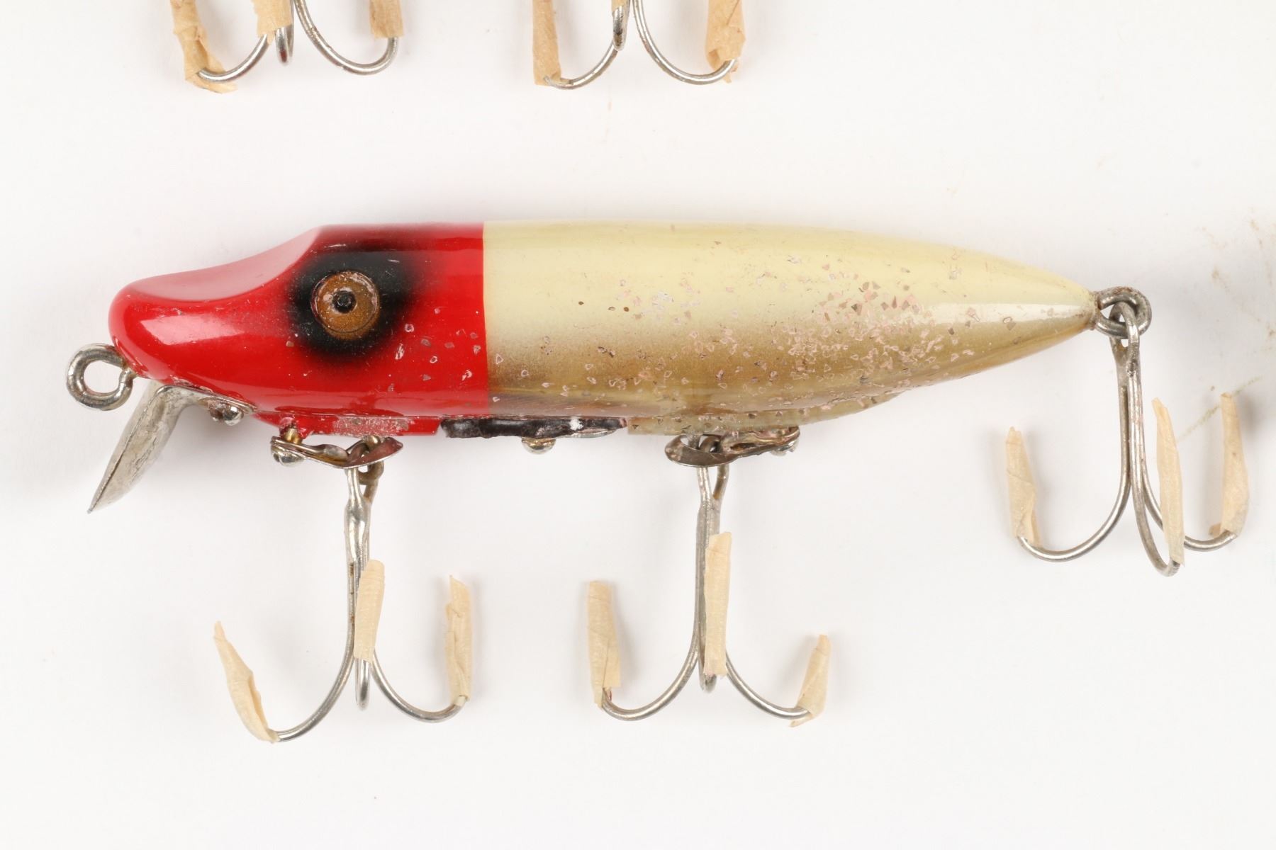 Lucky Strike Bait Works, Canada. 1940s. R/W, Red Side Perch, Silver Shore, Shiner Scale, Pike Scale. Material: Plastic. Quantity: 5. Grade: G+. 4" - 4.5" Est. $100-125.