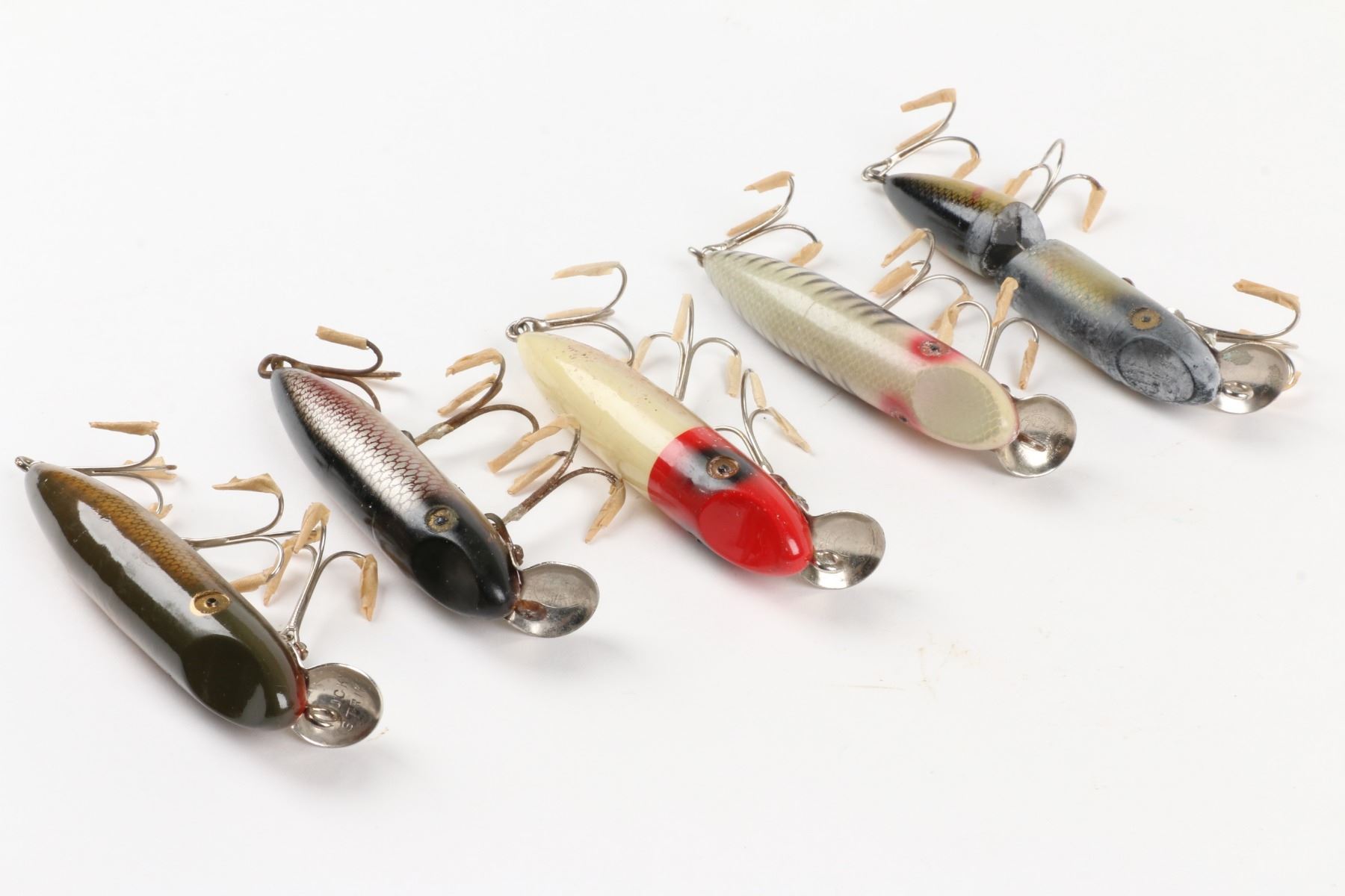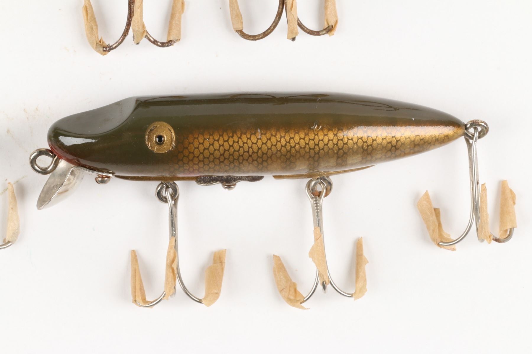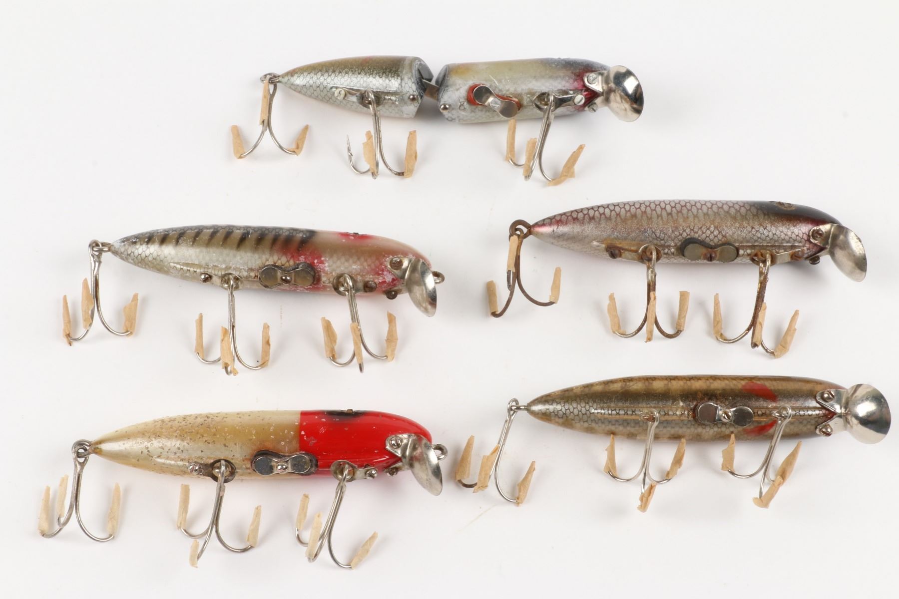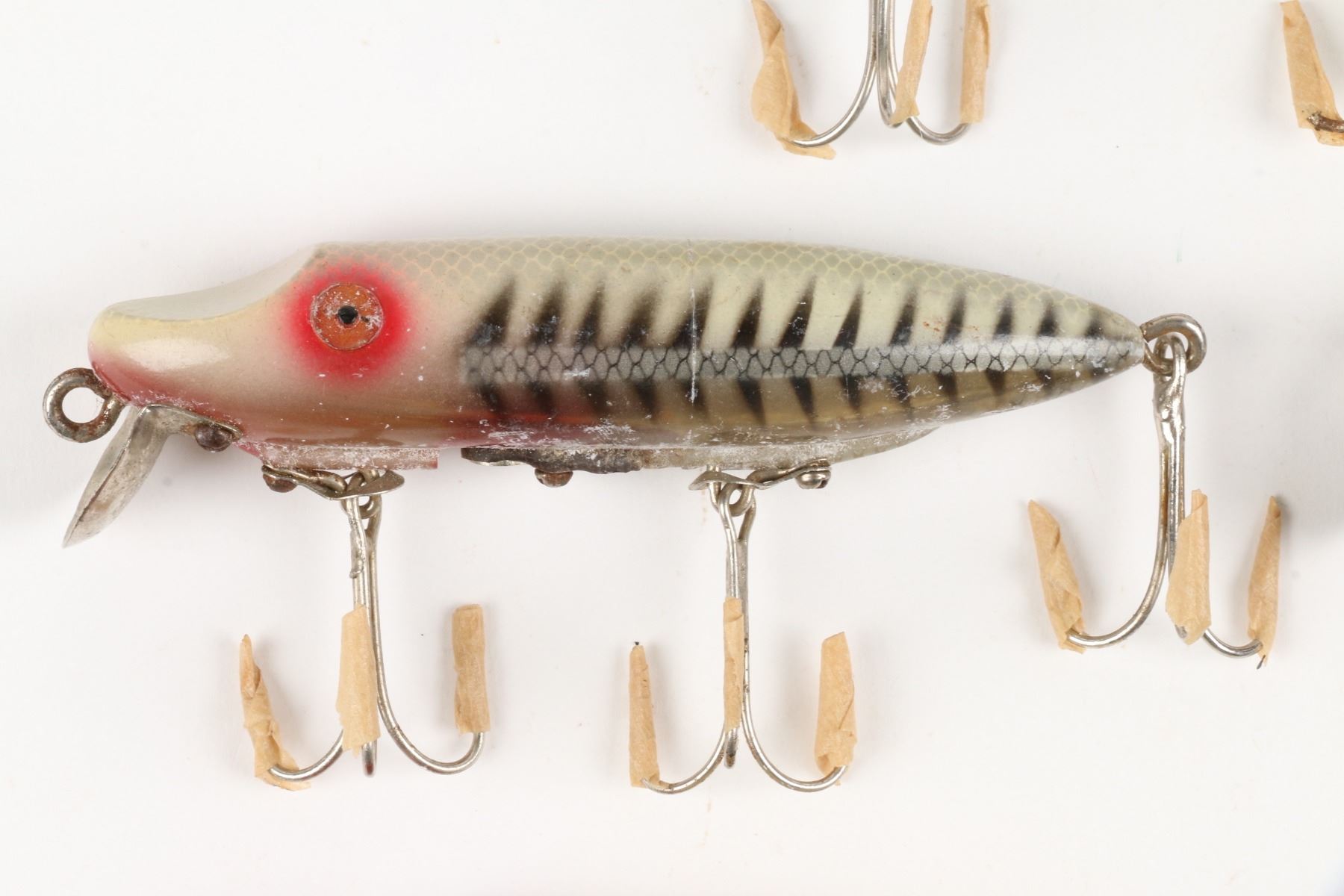 Lucky Strike Bait Works, Canada. 1940s. R/W, Red Side Perch, Silver Shore, Shiner Scale, Pike Scale. Material: Plastic. Quantity: 5. Grade: G+. 4" - 4.5" Est. $100-125.