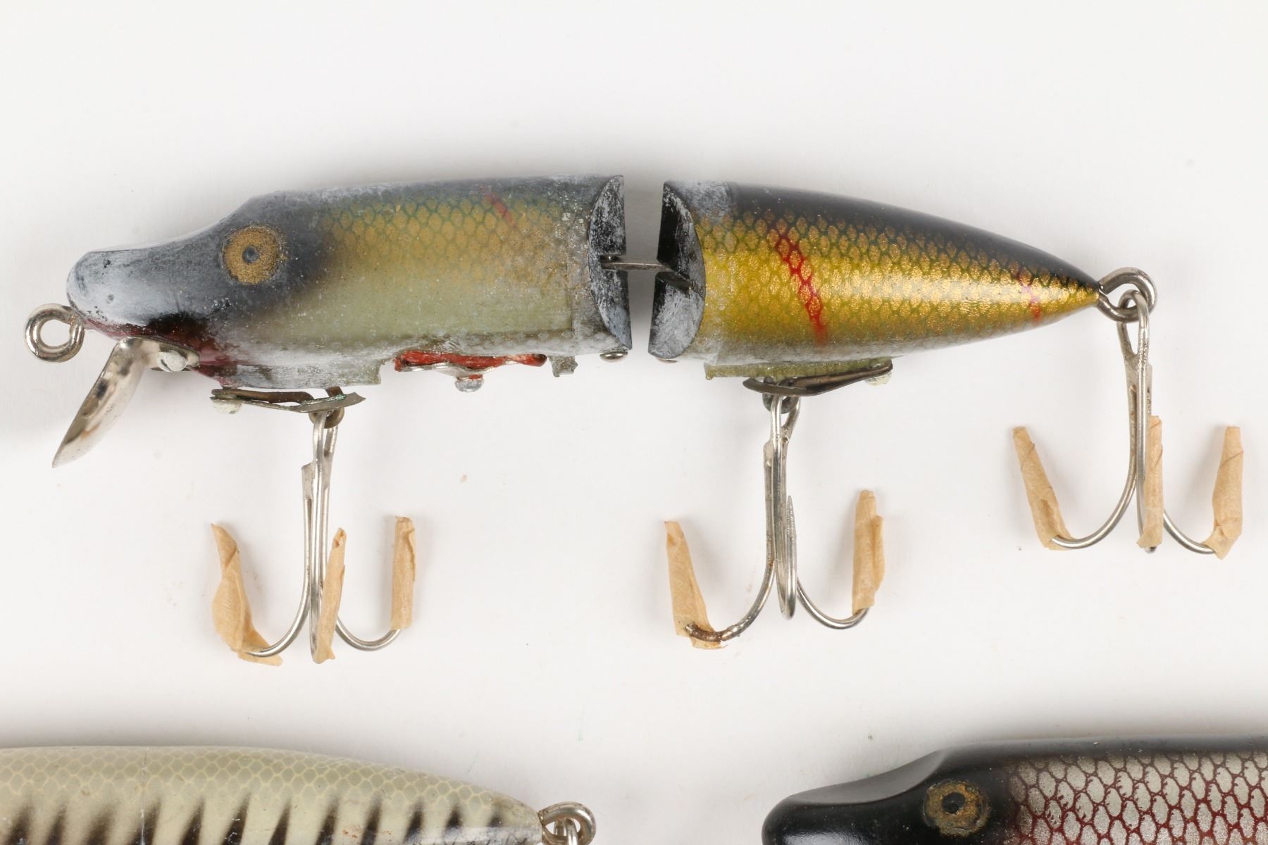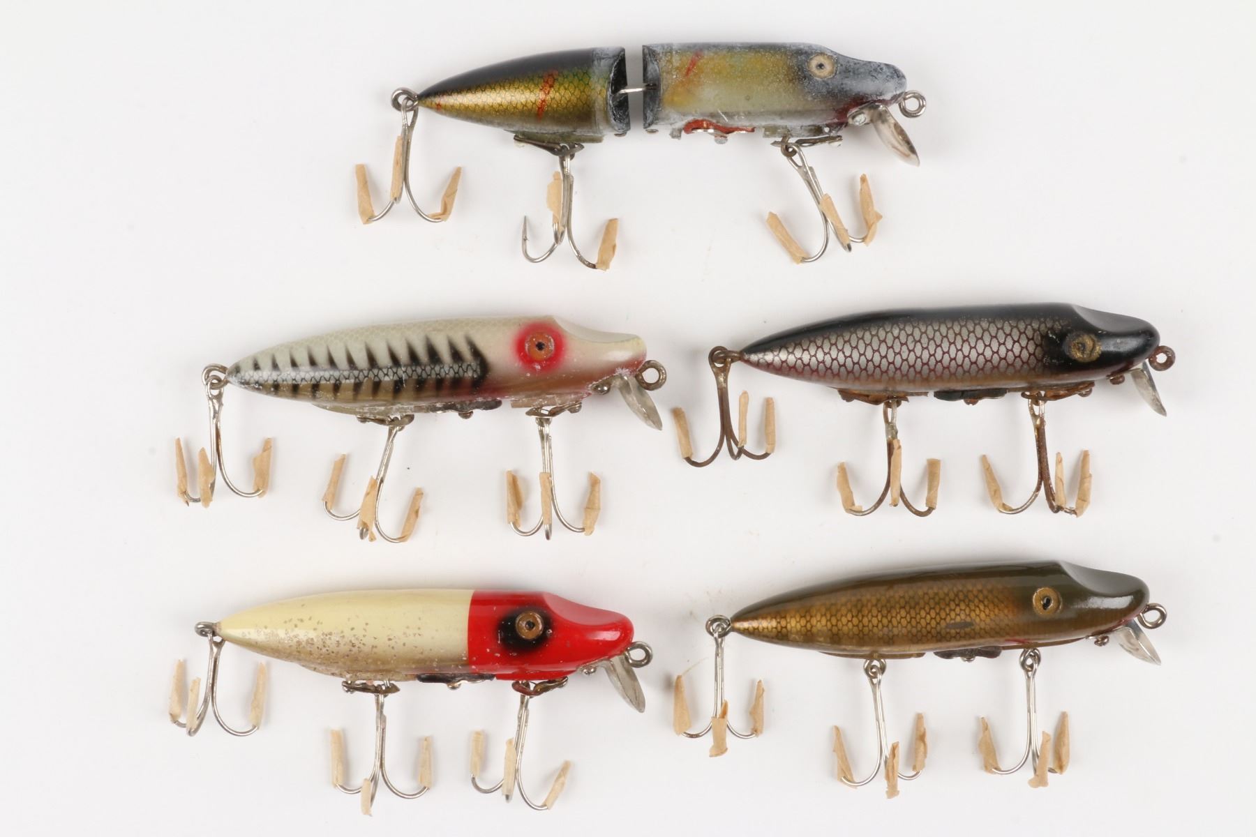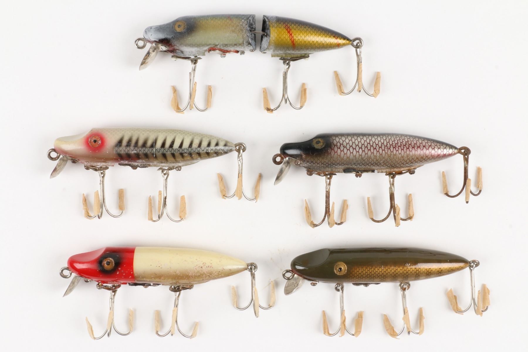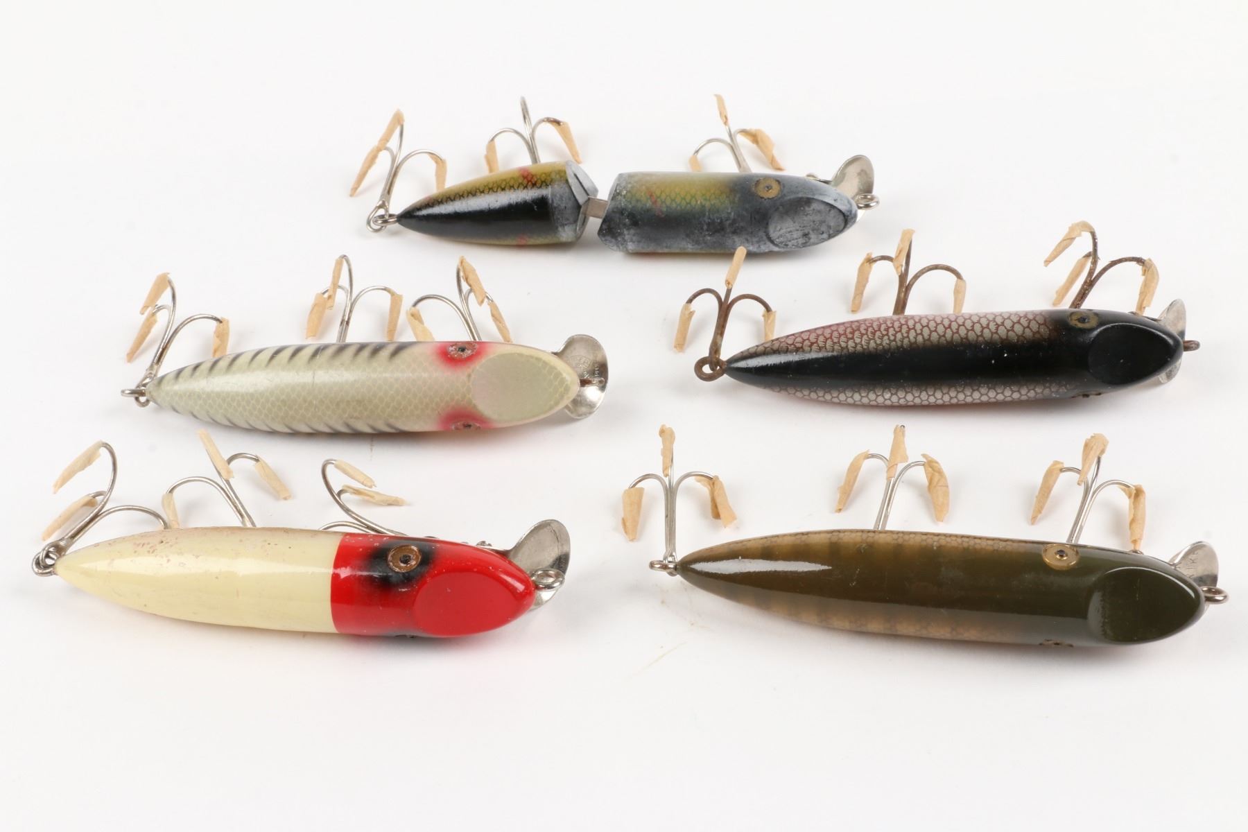 Lucky Strike Bait Works, Canada. 1940s. R/W, Red Side Perch, Silver Shore, Shiner Scale, Pike Scale. Material: Plastic. Quantity: 5. Grade: G+. 4" - 4.5" Est. $100-125.