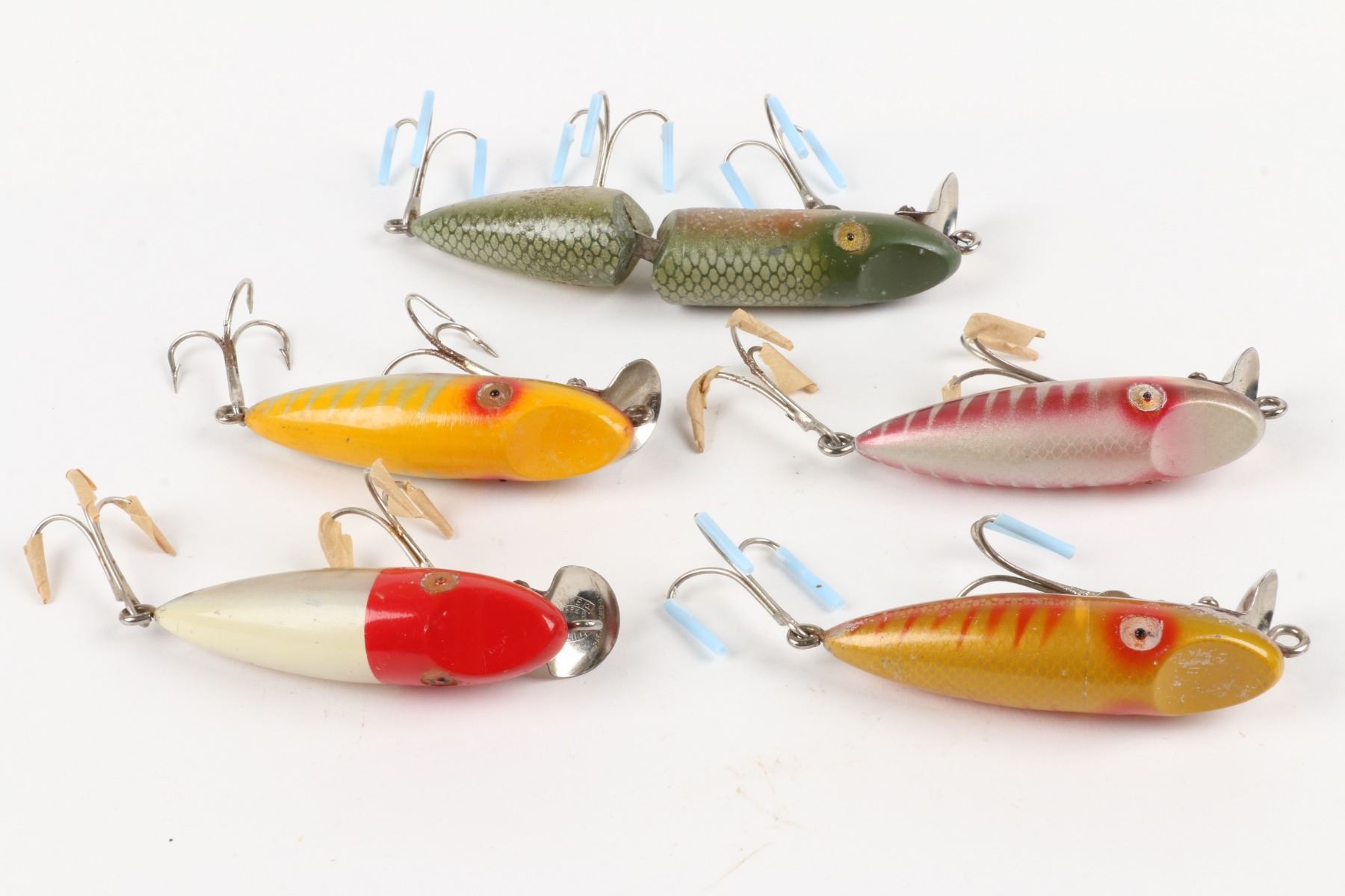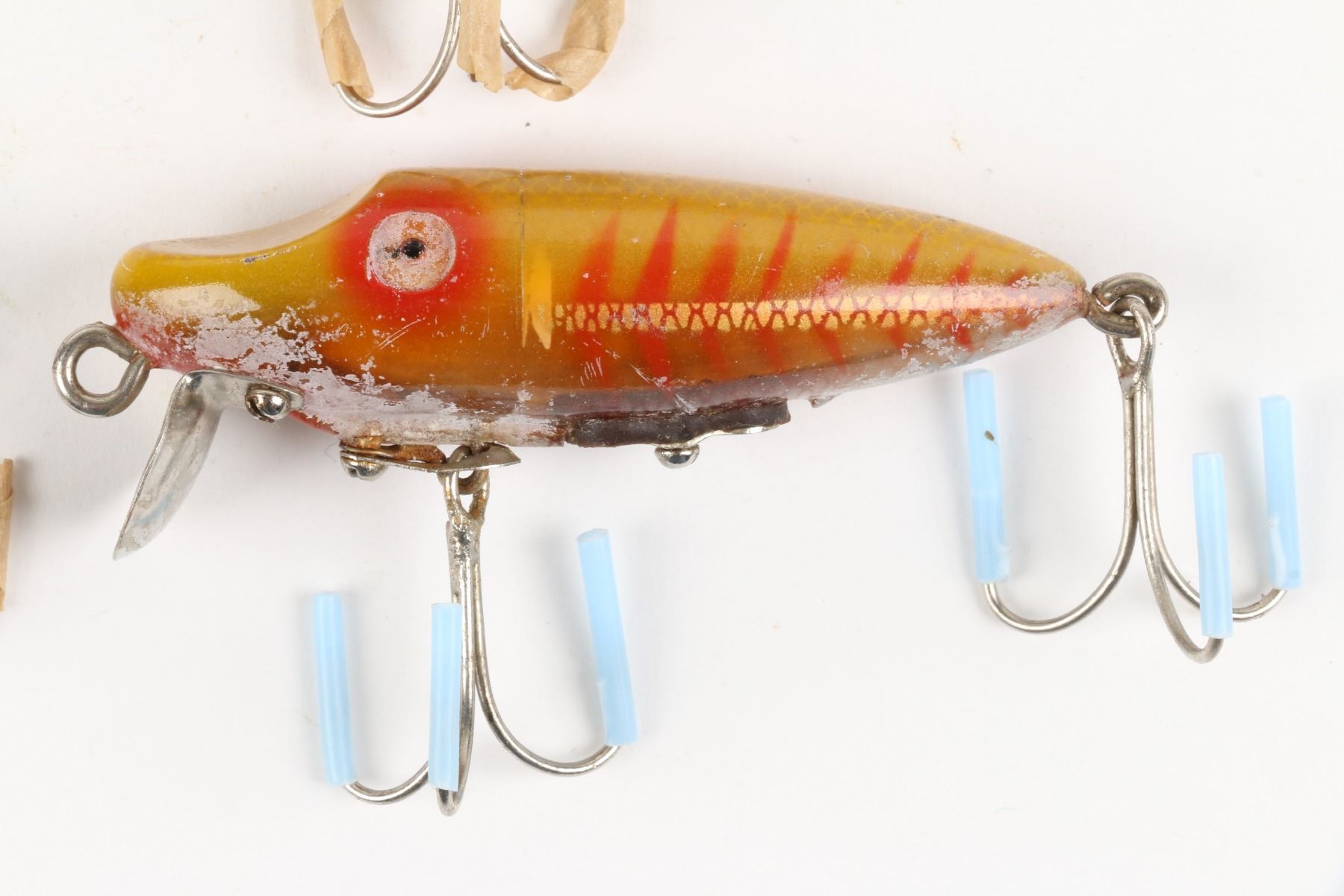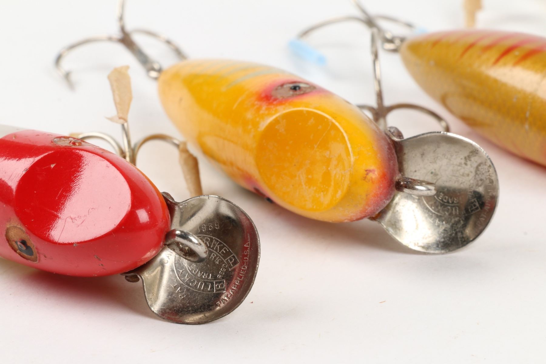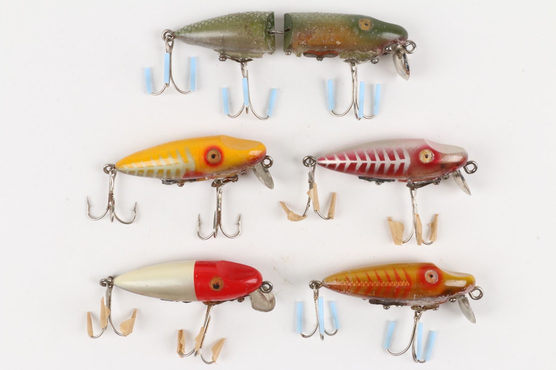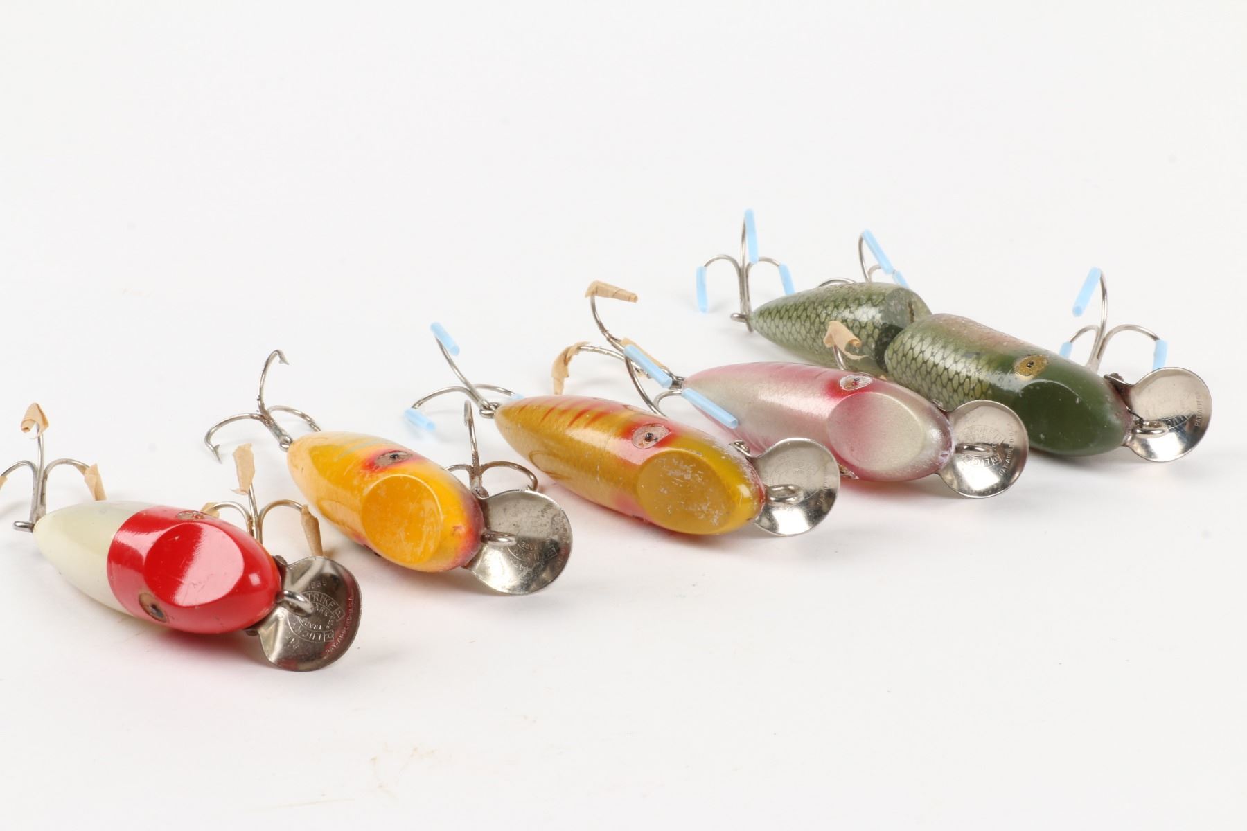 Lucky Strike Bait Works, Canada. 1940s. Mud Green, Yellow Shore, Red Shore, R/W, Yellow with Orange Shore. Material: Plastic. Quantity: 5. Grade: VG. 3" - 4.5" Est. $100-125.