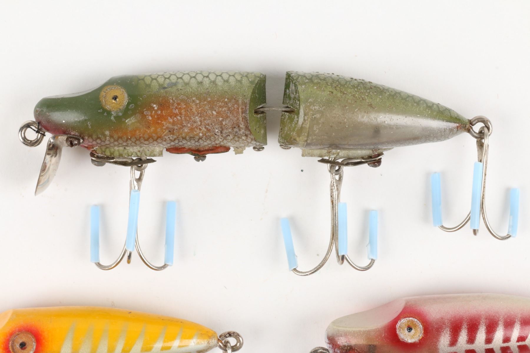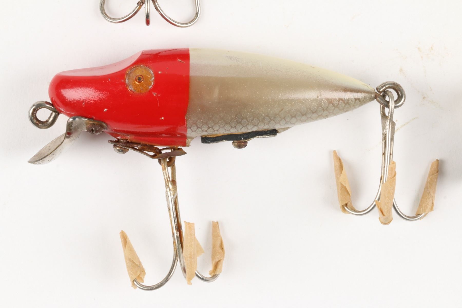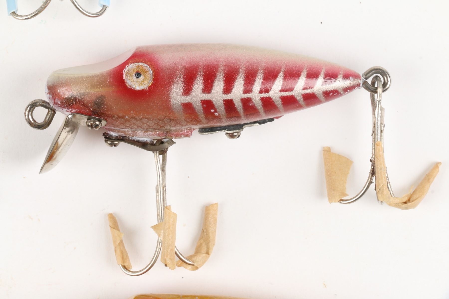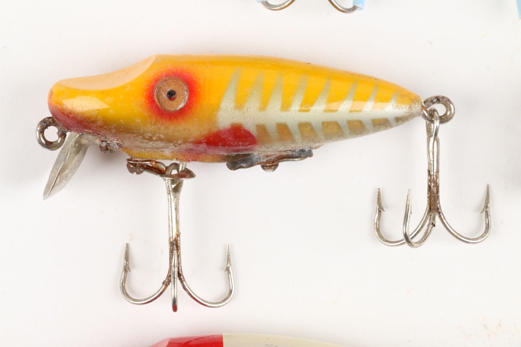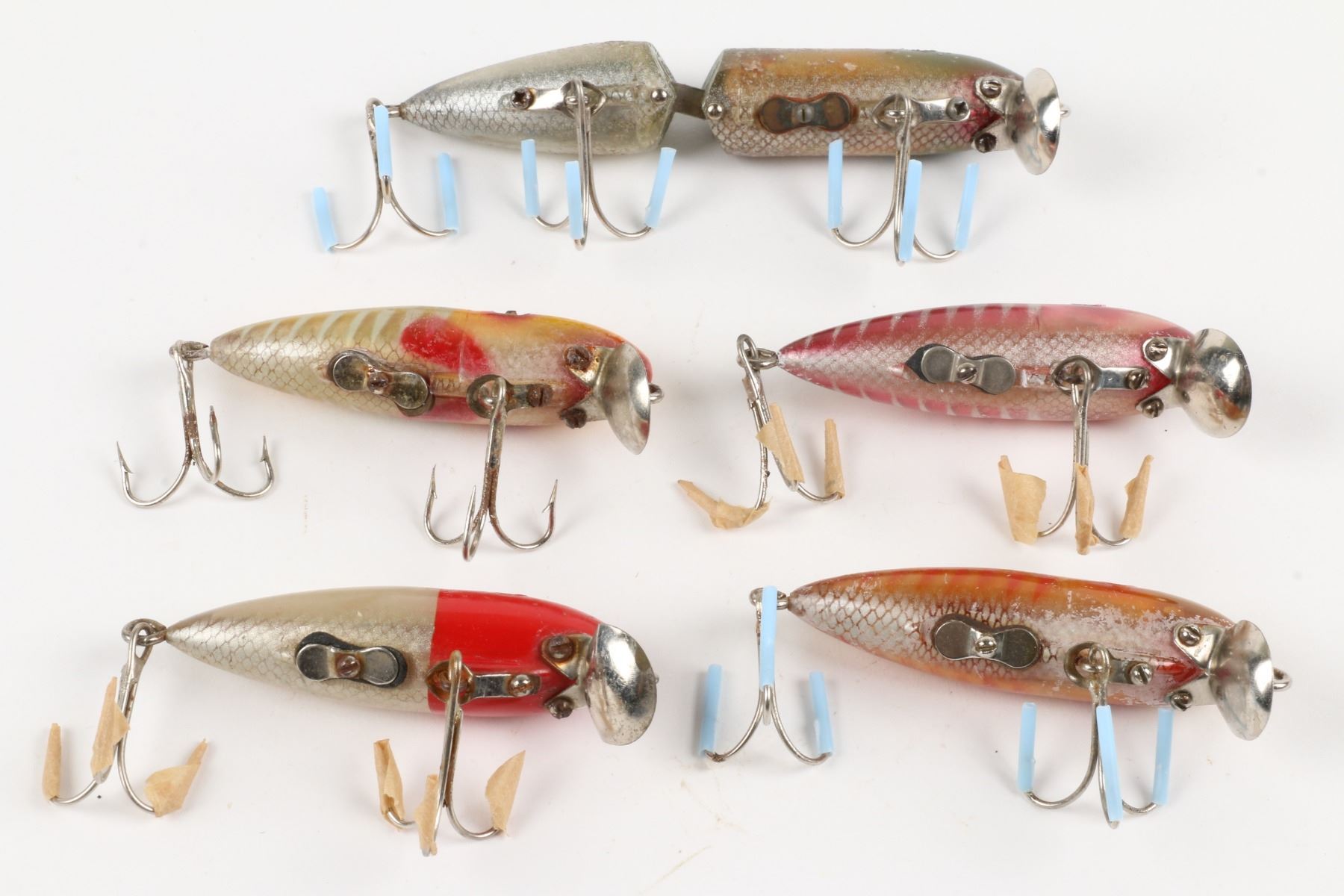 Lucky Strike Bait Works, Canada. 1940s. Mud Green, Yellow Shore, Red Shore, R/W, Yellow with Orange Shore. Material: Plastic. Quantity: 5. Grade: VG. 3" - 4.5" Est. $100-125.